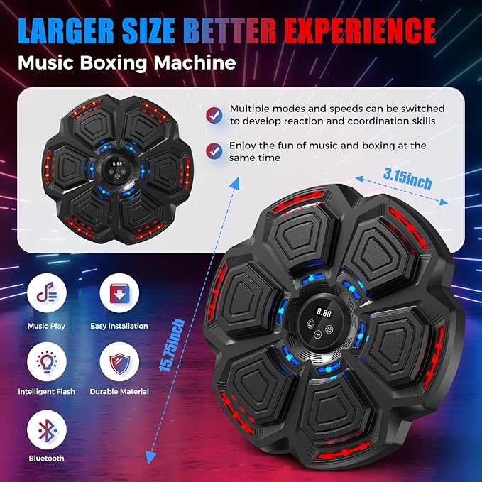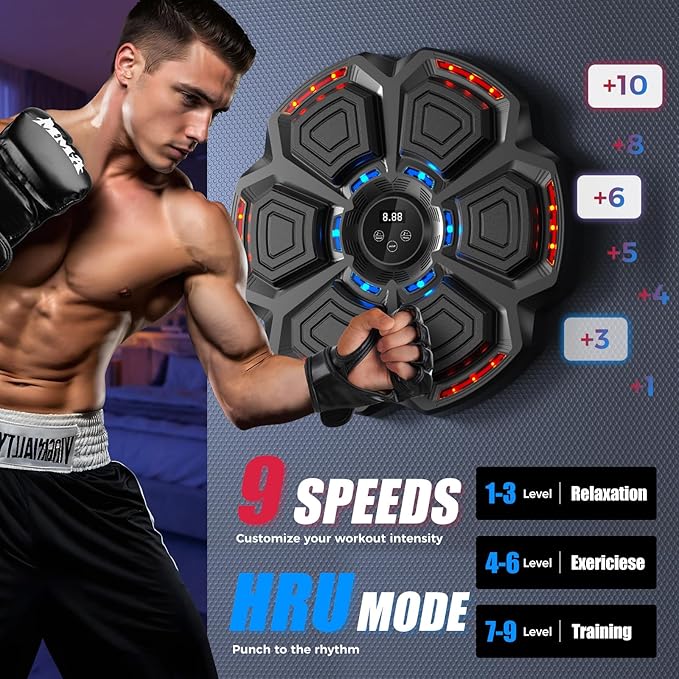 - Versatile Speed Options: The Music Boxing Machine features 9 adjustable speed levels, allowing you to customize your workout intensity. Enjoy hitting in rhythm with the accompanying light effects, enhancing both fun and fitness.