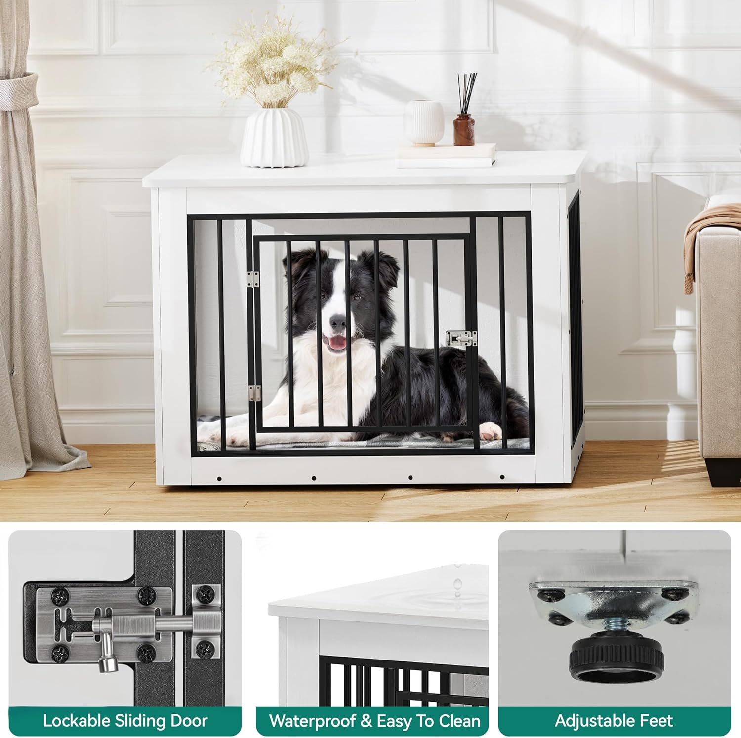 YITAHOME 38.2" L Dog Crate Furniture for Large Dogs, 2-in-1 Iron-Wood Fusion Dog cage Indoor up to 60 lb, Side End Table, Modern Dogs Kennel with Waterproof Top, Safety Corners,Steel Lock,White
