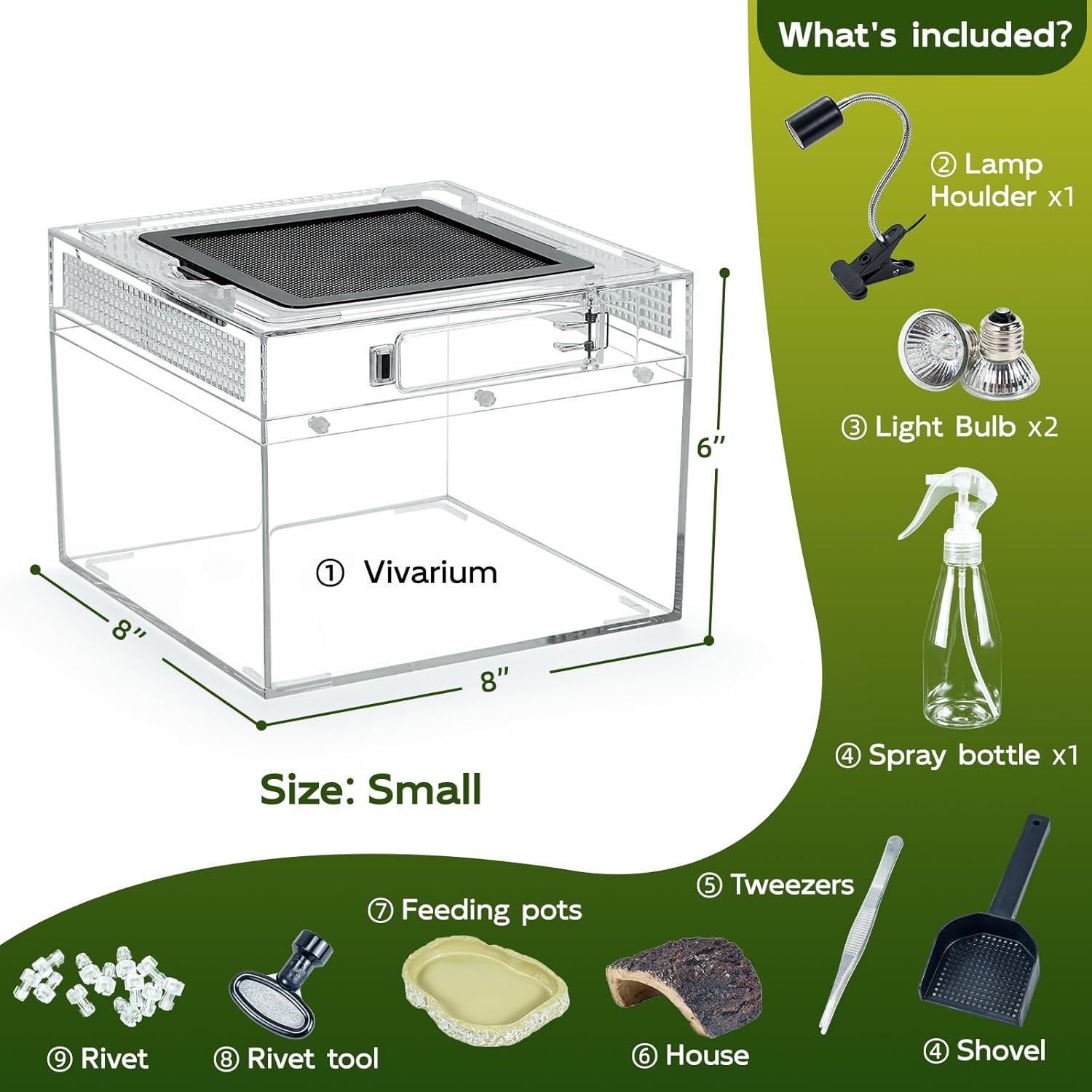 Reptile Tank Kit with Heat Lamp, Spray Bottle, Shovel, Tweezers, Food Bowl, Hideout -Perfect for Geckos, Jumping Spider,Milk Frog,Hermit Crabs,Snakes, Lizards (8''×8''×6'')