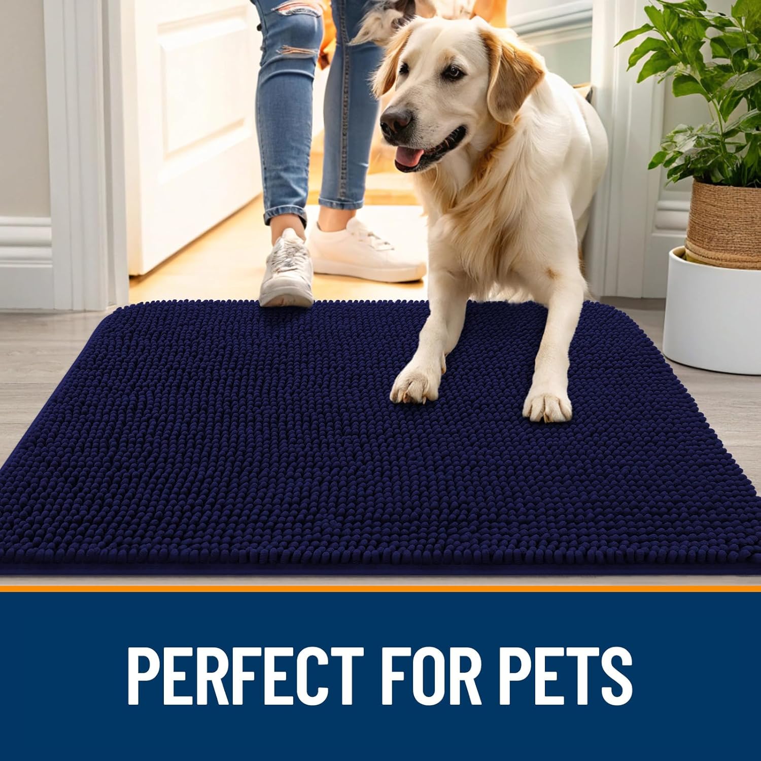 OLANLY Dog Door Mat for Muddy Paws 34x21, Absorbs Moisture and Dirt, Absorbent Non-Slip Washable Doormat, Quick Dry Chenille Mud Mat for Dogs, Entry Indoor Entryway Carpet for Inside Floor, Navy Blue