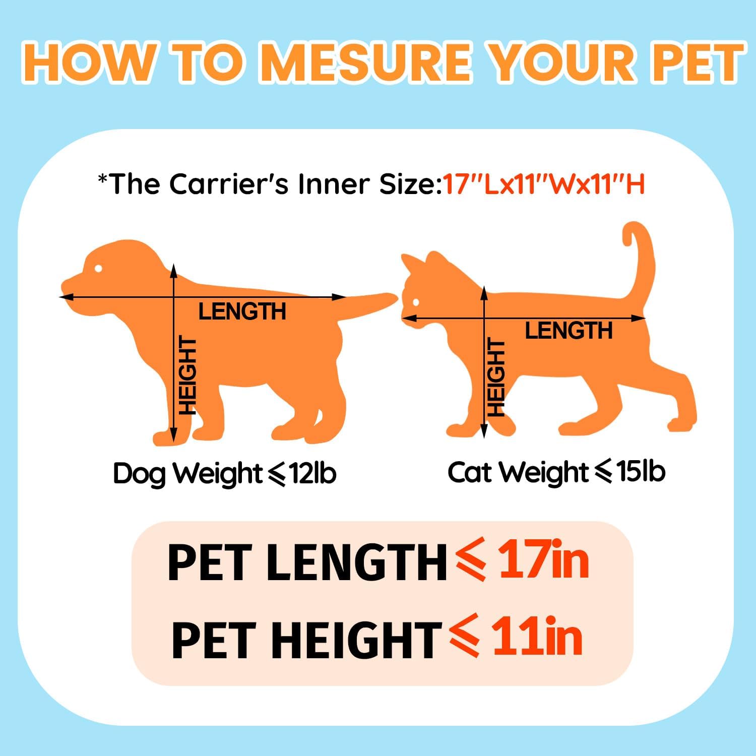 - 【CHECK SIZE BEFORE BUYING】In order to fit the under-seat dimensions of airlines, this carrier can only fit small dogs. We recommend that the pet size you carry be within 17"L x 11"W x 11"H ,dog weight under 12lbs and cat weight under 15lbs. Please don't choose the carrier only based on weight but also reference your pet's length and height.