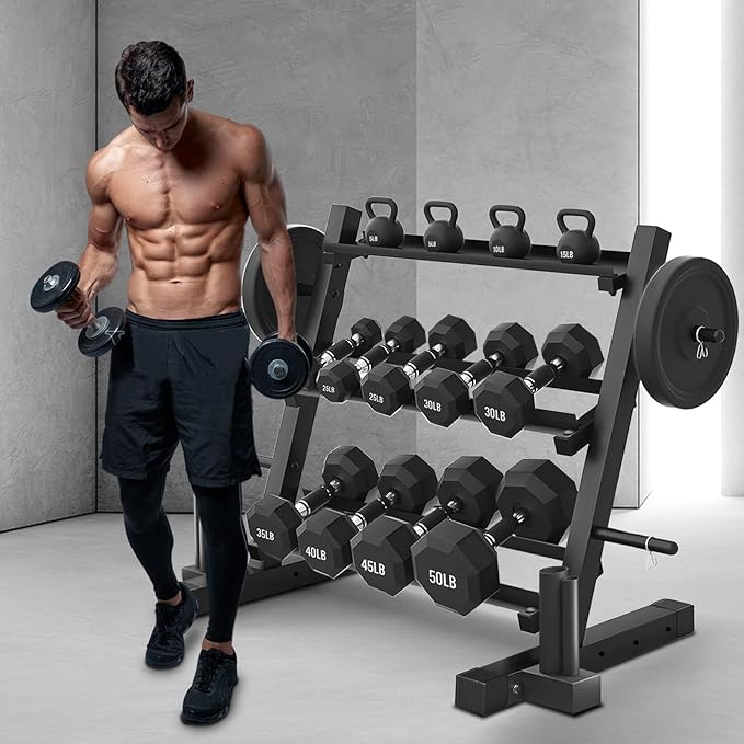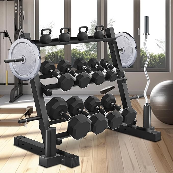 - Stay Organized with Ease: This compact weight rack features a space-saving three-tier design and an angled structure for effortless access to your equipment. Its ergonomic layout allows you to neatly store a variety of fitness gear, including dumbbells, kettlebells, weight plates, and Olympic bars. Perfect for home gyms, this rack helps you eliminate clutter and keep your workout area tidy and efficient.