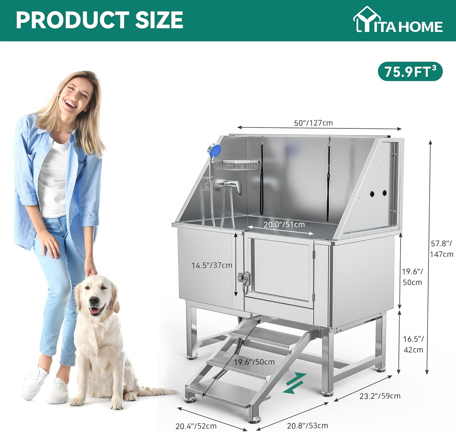 YITAHOME Professional Dog Bathtub 50in, Stainless Steel 304 Dog Bathing Station for Home, Pet Grooming Tub w/Right Stairs, Faucet, Floor Grate, Pet Washing Station for Large, Medium, Small Pets