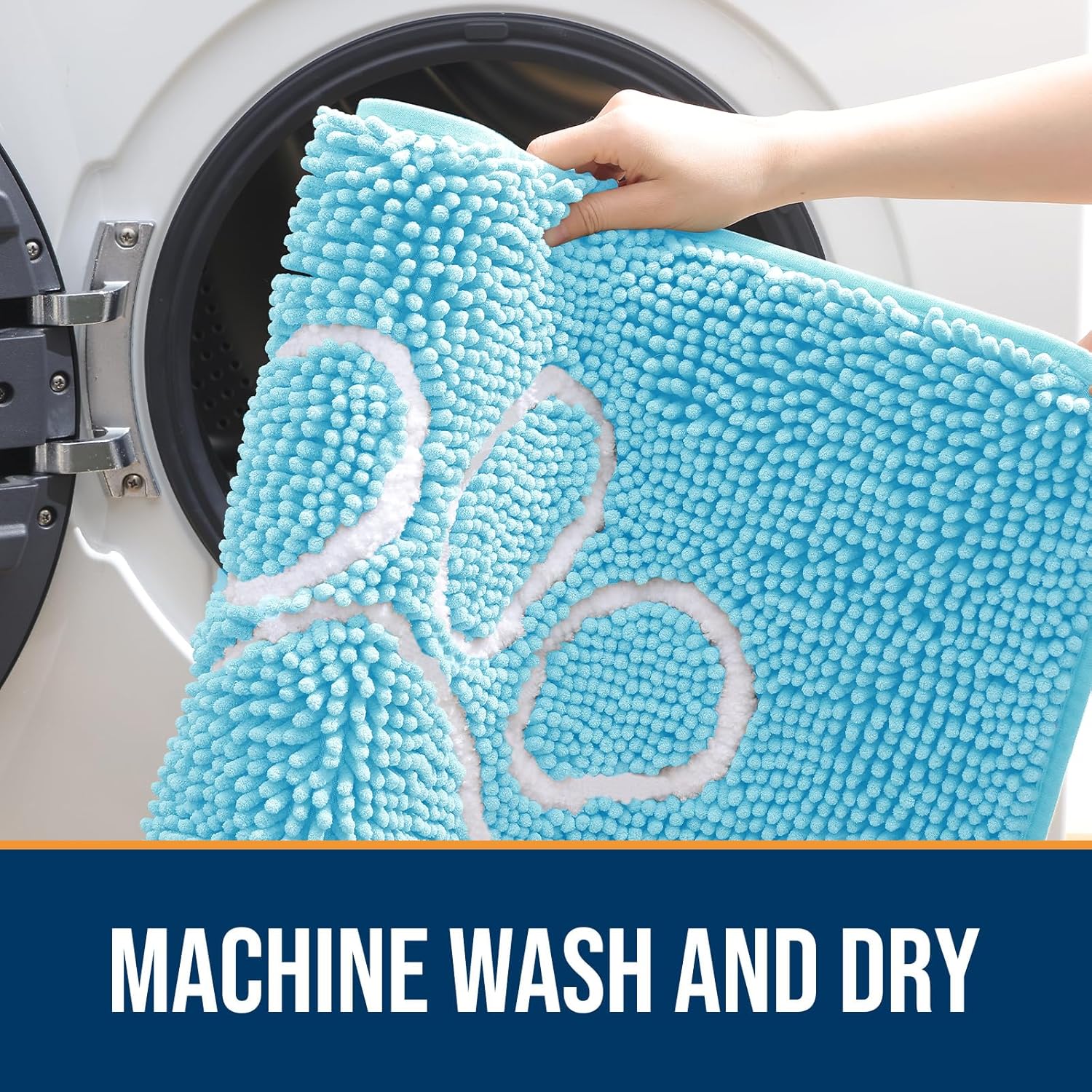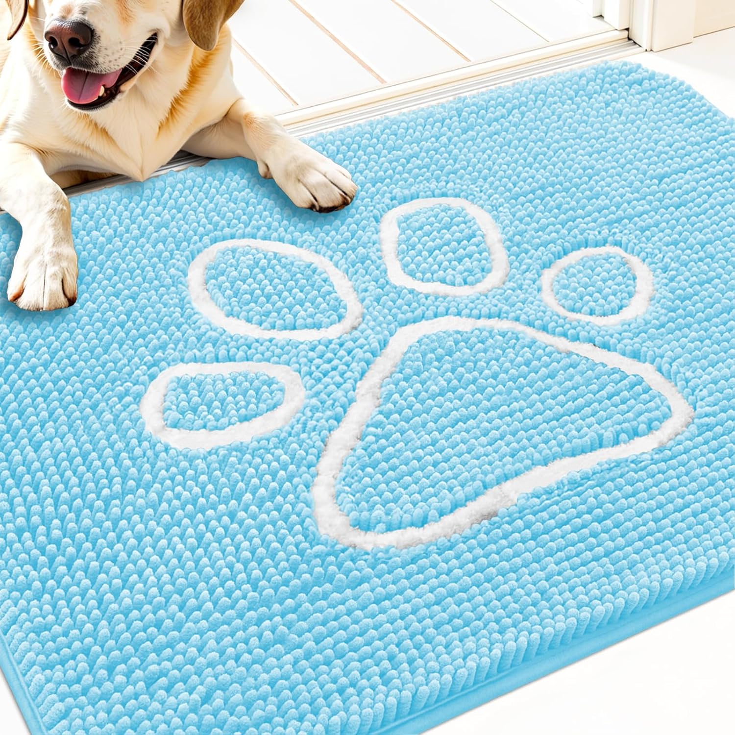 OLANLY Door Mat for Muddy Dog Paws 30x20, Ultra Absorbent Chenille Mud Doormat with Paw Print Design, Non-Slip Washable Doormat for Indoor Entryway, Quick-Dry Pet Bed Mats for Dirty Dogs, Blue