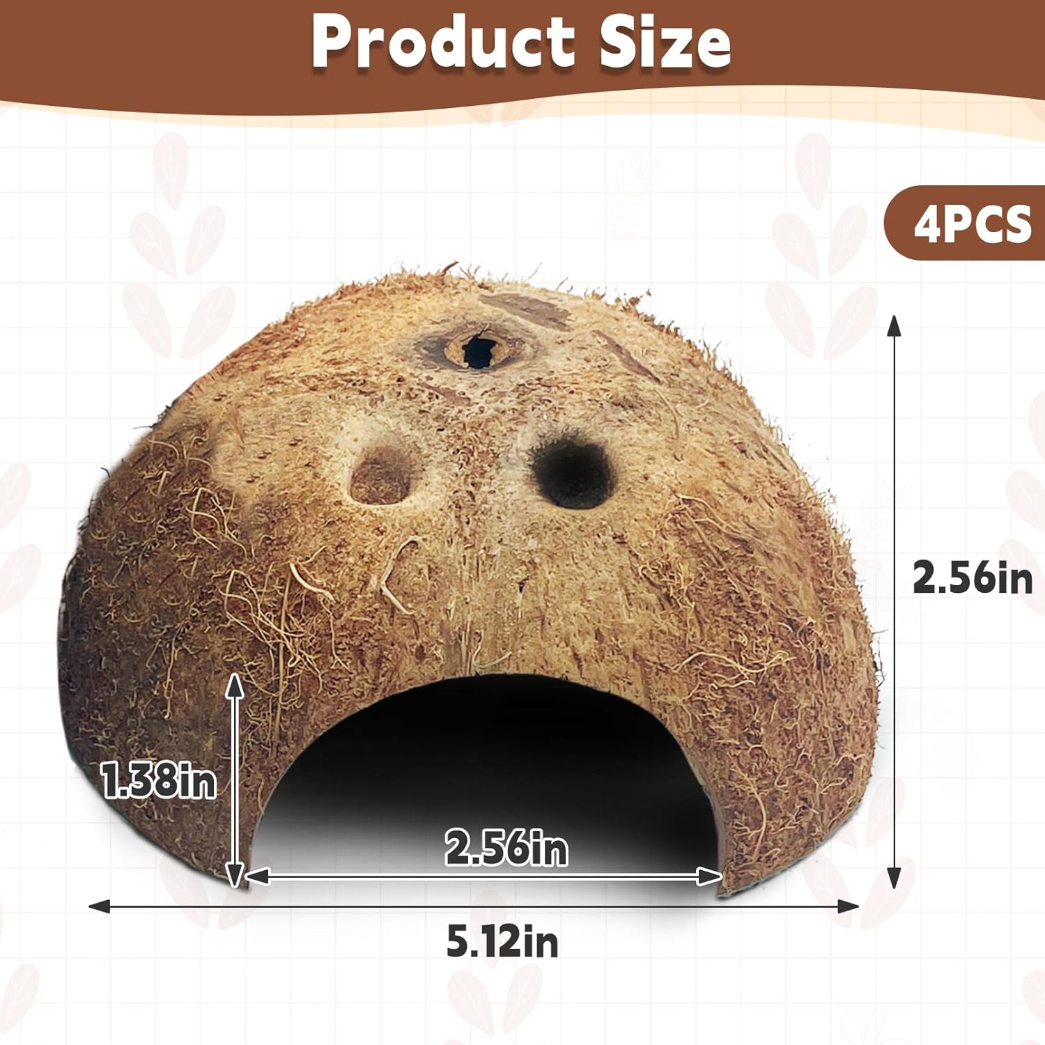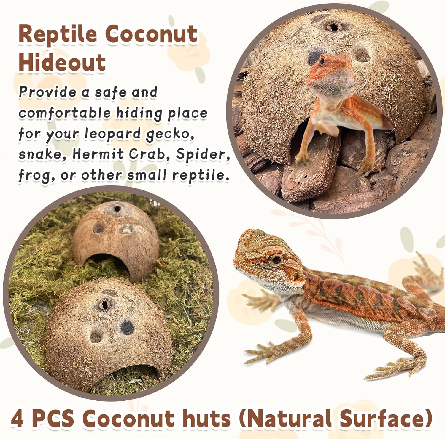 - Natural coconut materials: Our reptile hideout is made from natural coconut shells to provide a safe and comfortable hiding place for your lizard, leopard gecko, snake, hermit crab, spider, frog, or other small reptile