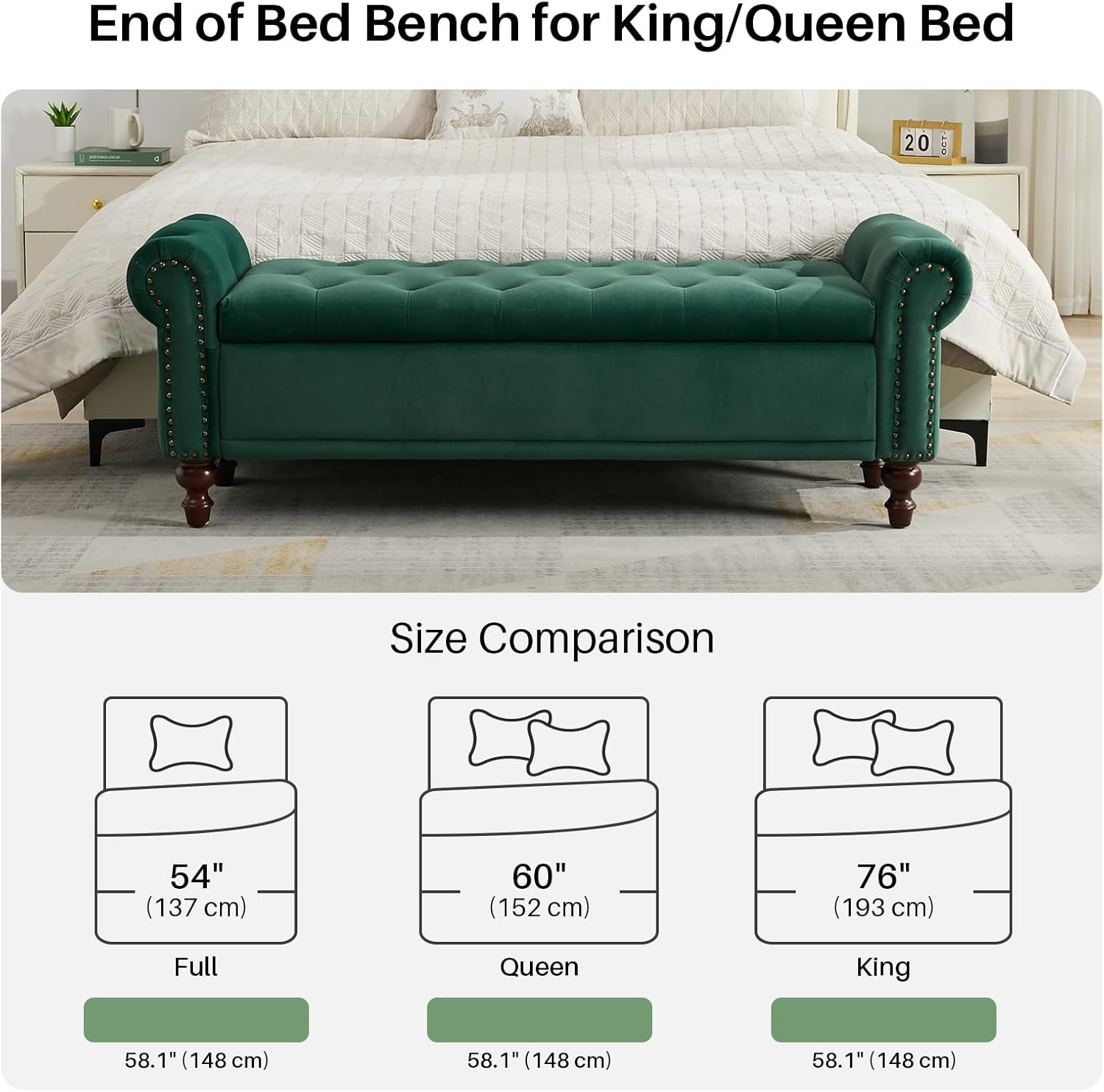 58.1'' Storage Bench Upholstered Velvet End of Bedroom Bed Bench Ottoman with Tufted Cushioned Rolled Arm Large Storage Space for Reading Living Room Entryway,Dark Green