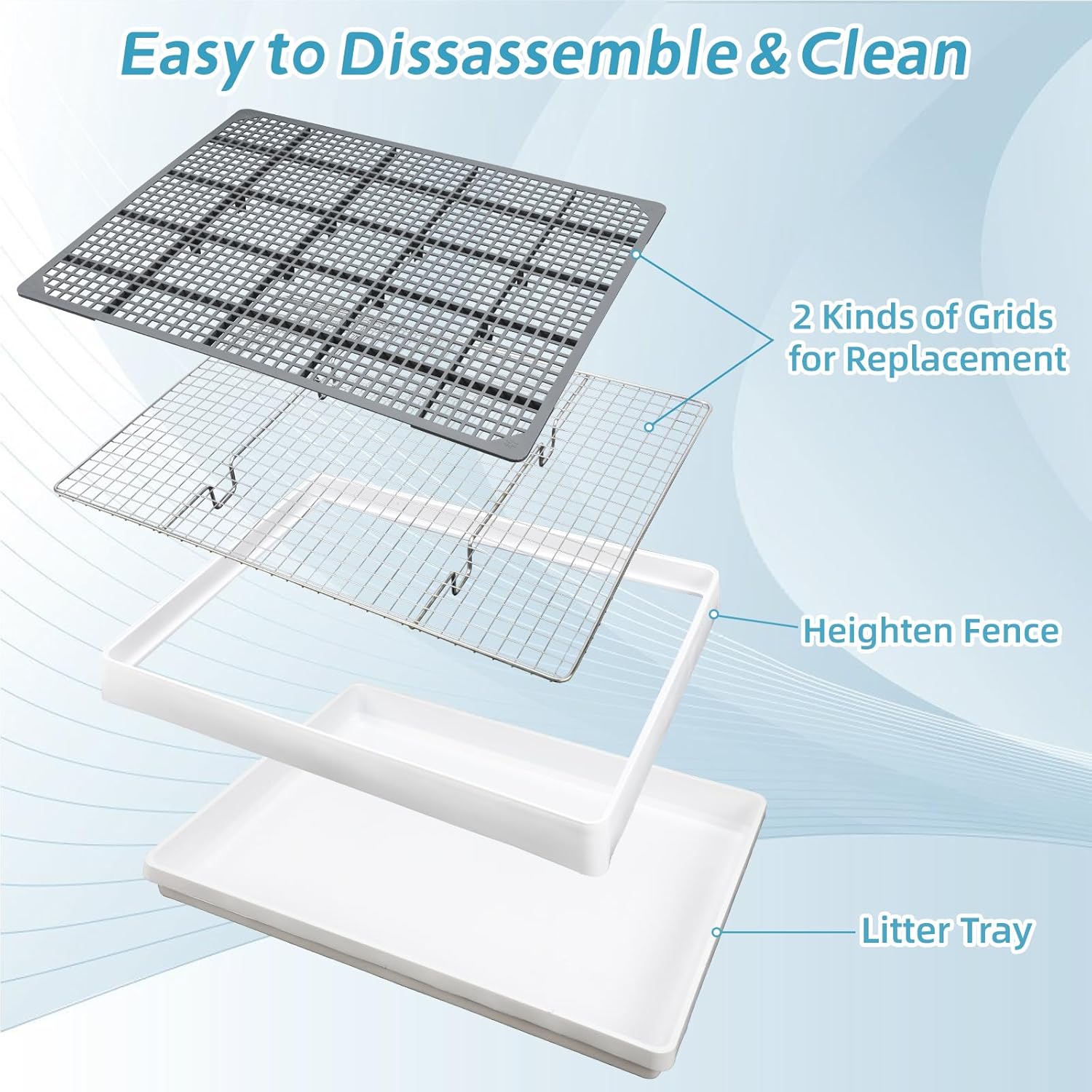 - Ultra Large Rabbit Tray: Our steel grids rabbit litter box is 22"/56cm x 18"/46cm x 3"/7.6cm (L*W*H), and the bottom depth 1.57 inches (Can be storaged 3 days shits of 2 adult rabbits); The extra large size and multi rabbits are able to fit at the same time with plenty of room to spare to set their feeding bowls on top of as well; Tthe rectangular shape fits nicely in the cage corner