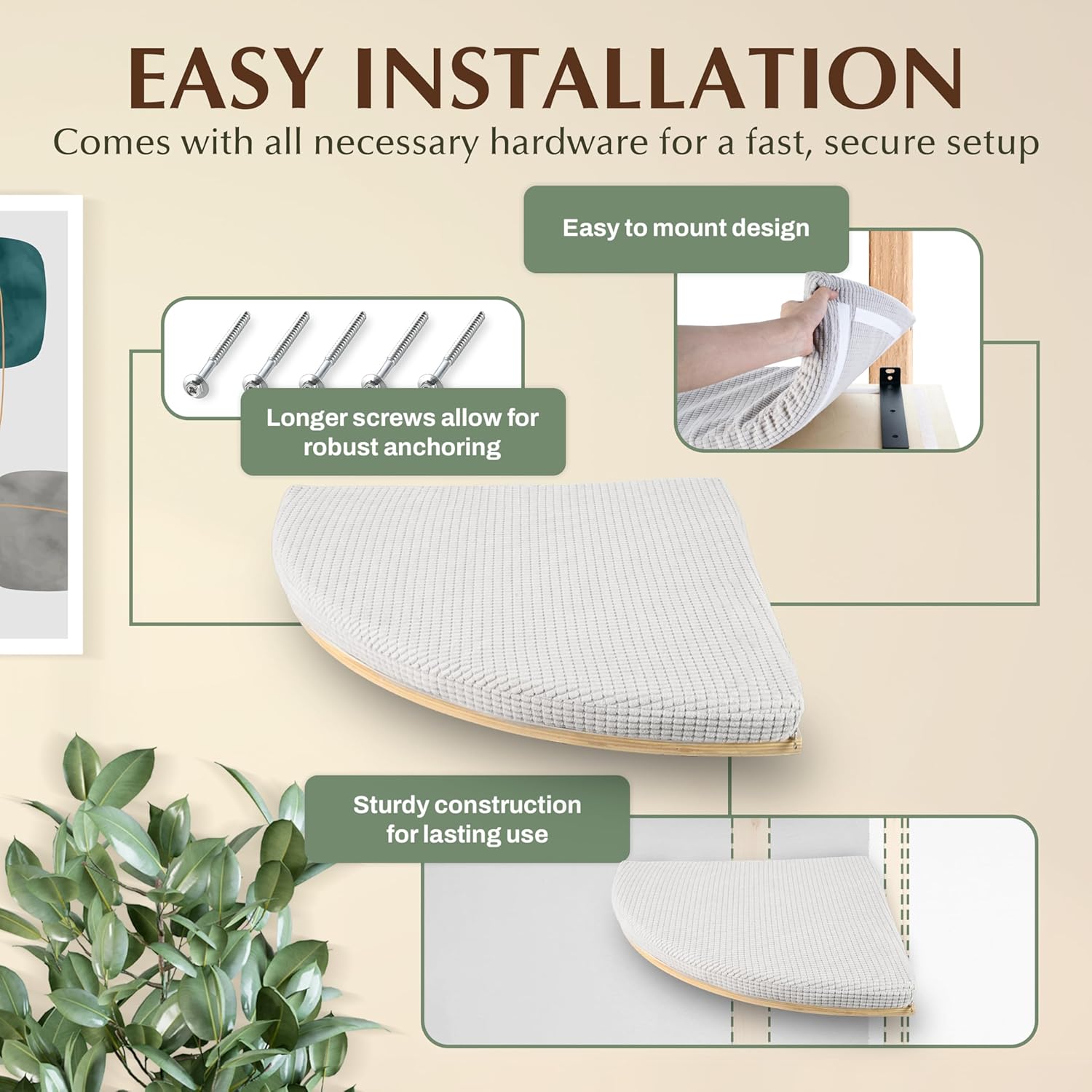 - EASY INSTALLATION, WITH HIDDEN MOUNTS - Pre-drilled holes and included hardware make setup a breeze. The sleek, hidden-mount design conceals screws and brackets for a modern cat wall shelf look. Whether you’re creating a cat climbing wall or adding floating cat shelves, installation is quick and seamless.