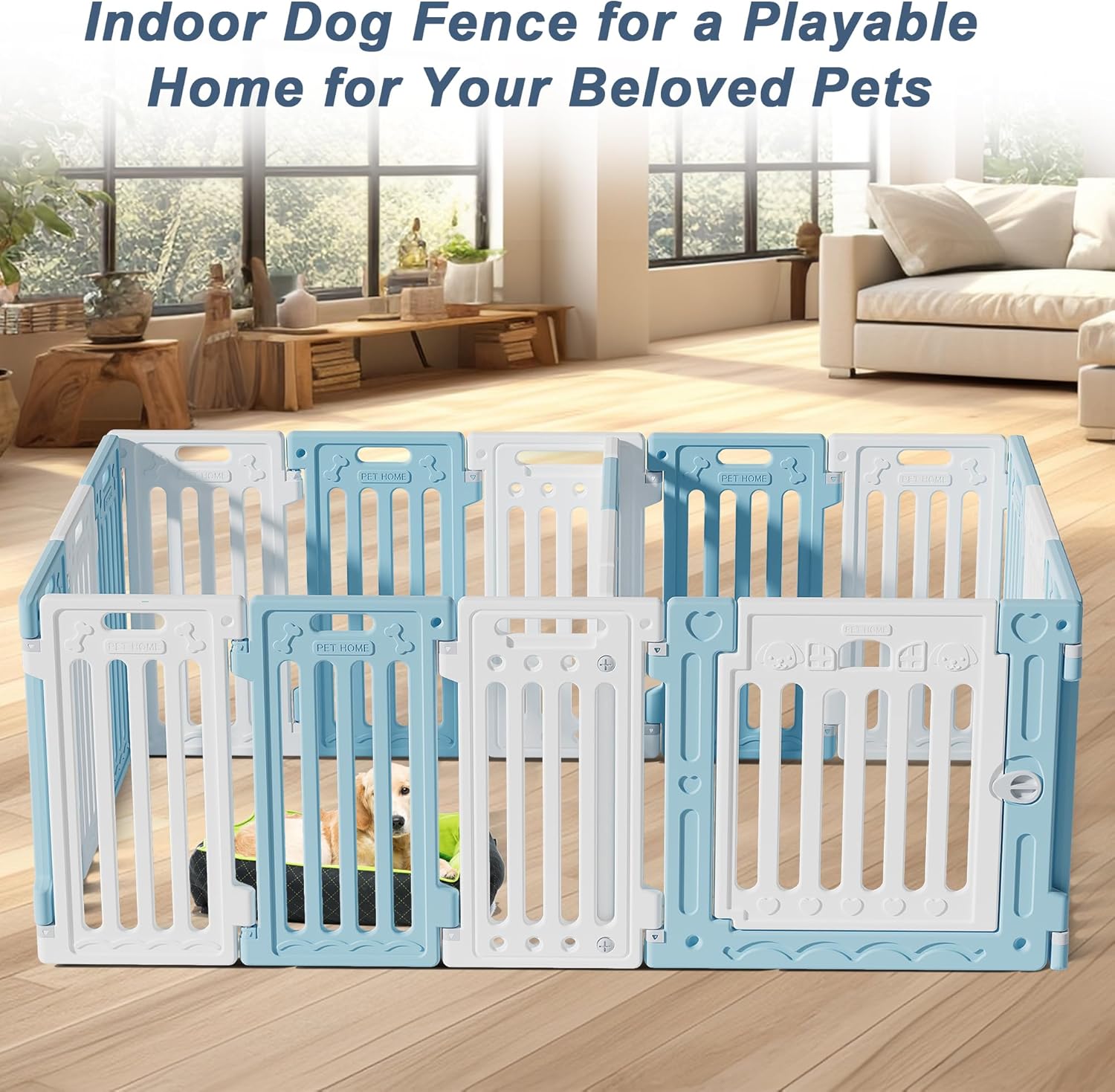 2 Room Dog Playpen with Door,DIY Shape Combination Puppy Pen,16-Panel+2 Link Piece+Large Door+Small Door,25.5" H Dog Fence,Non-Slip&Secure Pet Gate,Easy to Assemble,Blue+White