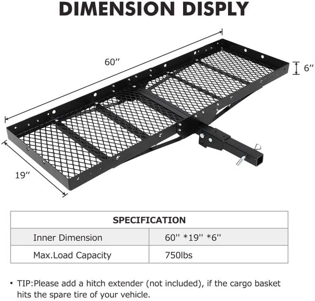 750 Lbs Capacity Hitch Mount Cargo Carrier Basket - Heavy-Duty Cargo Baskets, 60" x 19" x 6" Cargo Rack Rear Luggage Basket for Car and SUV