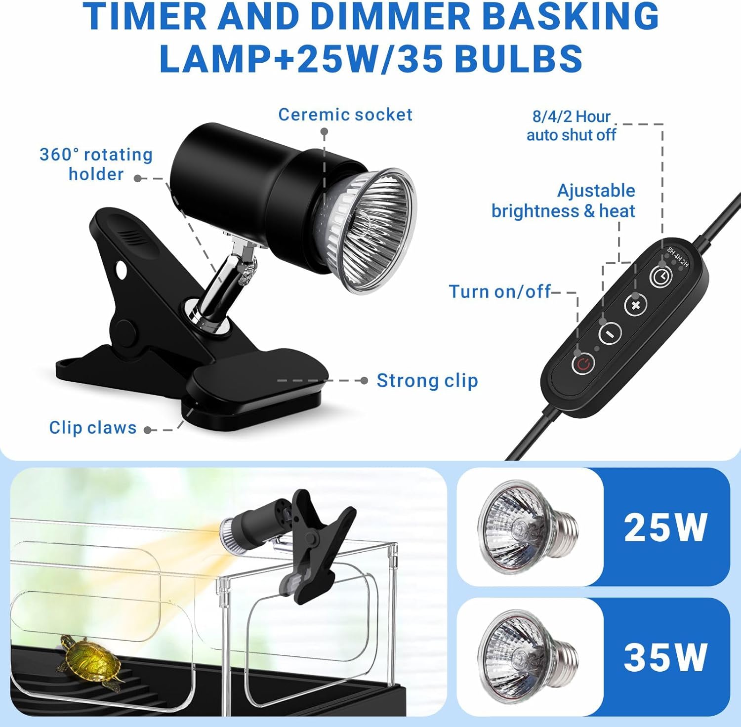 - 【ADJUSTABLE UVA/UVB BASKING LAMP + 25W/35W BULBS】Turtles need 1-2 hours of sunlight per day for metabolism, mood regulation, reproduction, etc. Sunlight simulation lamp provide optimal warmth at a distance of 10" to 15". In addition to controlling the brightness, basking lamp can also be set for 2, 4 or 8 hour with auto shut-off function. Making cozy sunbath for your reptile friends.(Note:The rated voltage power is applicable to 110V-130V)
