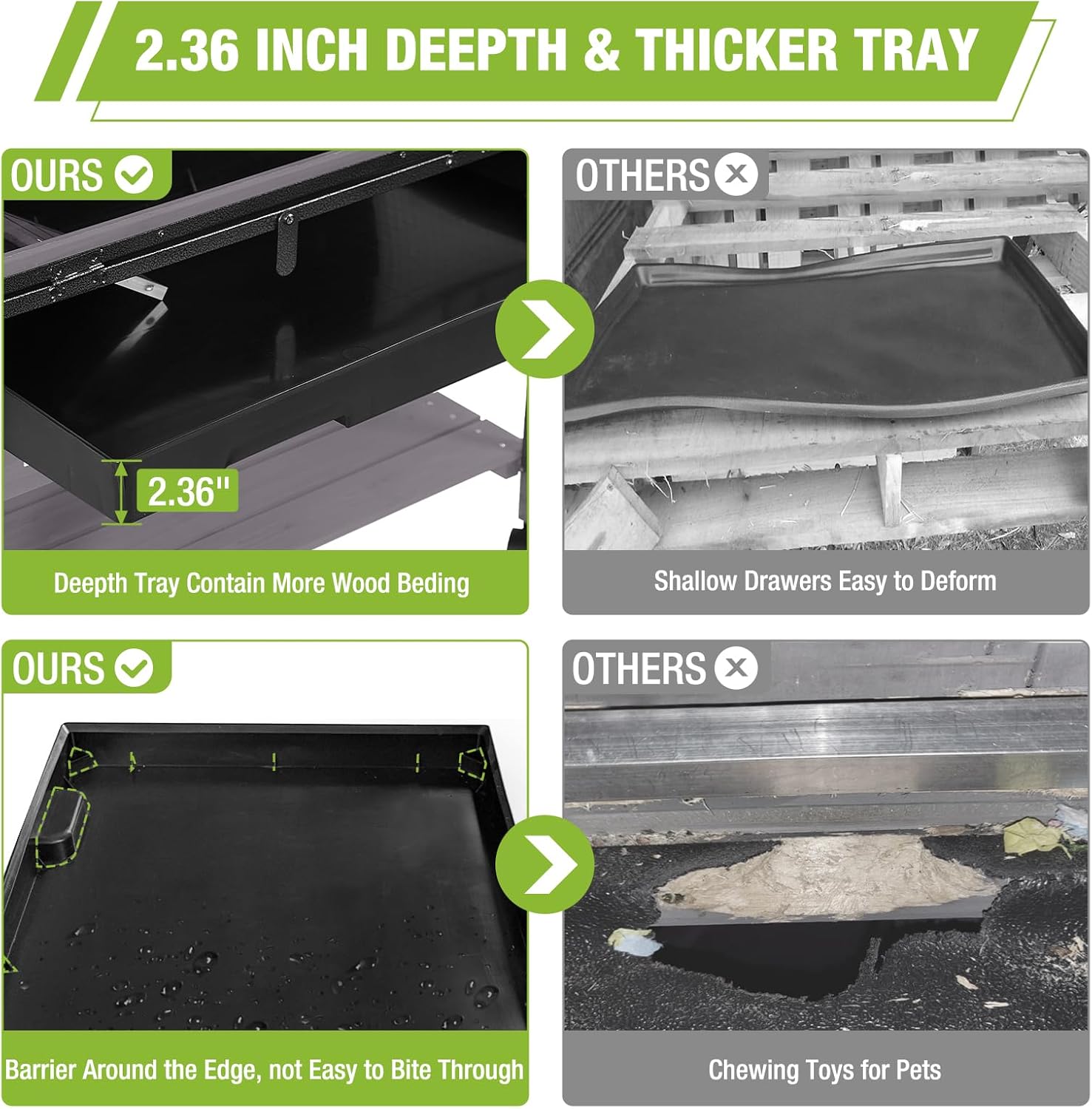 - 2.36" Deep Tray: The deepened plastic tray gives you ample space for bedding, with special baffles in the corners to prevent pets from chewing