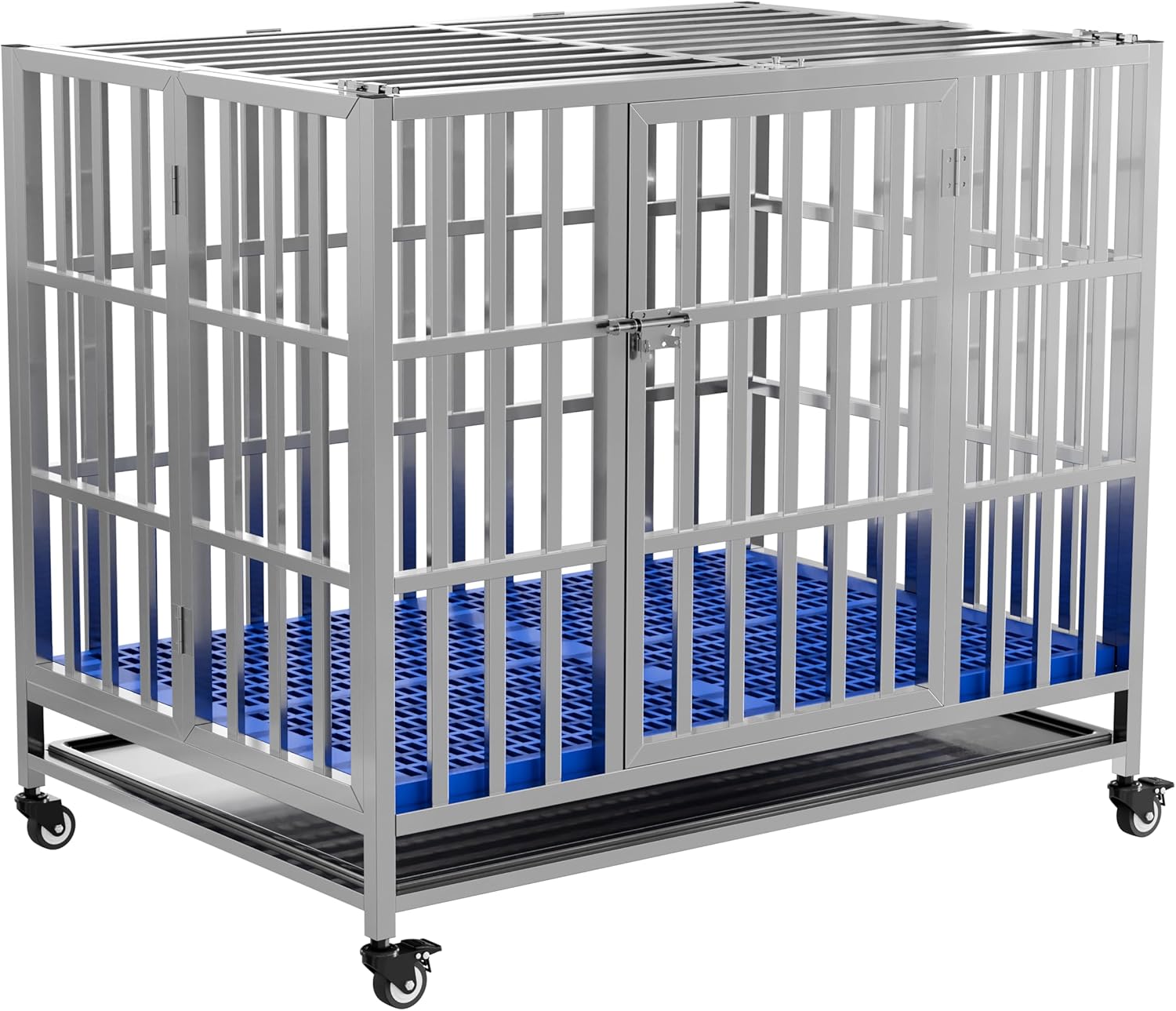 Collapsible Stainless Steel Dog Crate, 30" 37" 42" 48" Sizes, Lockable Wheel, with Tray, Stackable, Heavy Duty, Divider, Indoor and Outdoor (37in)