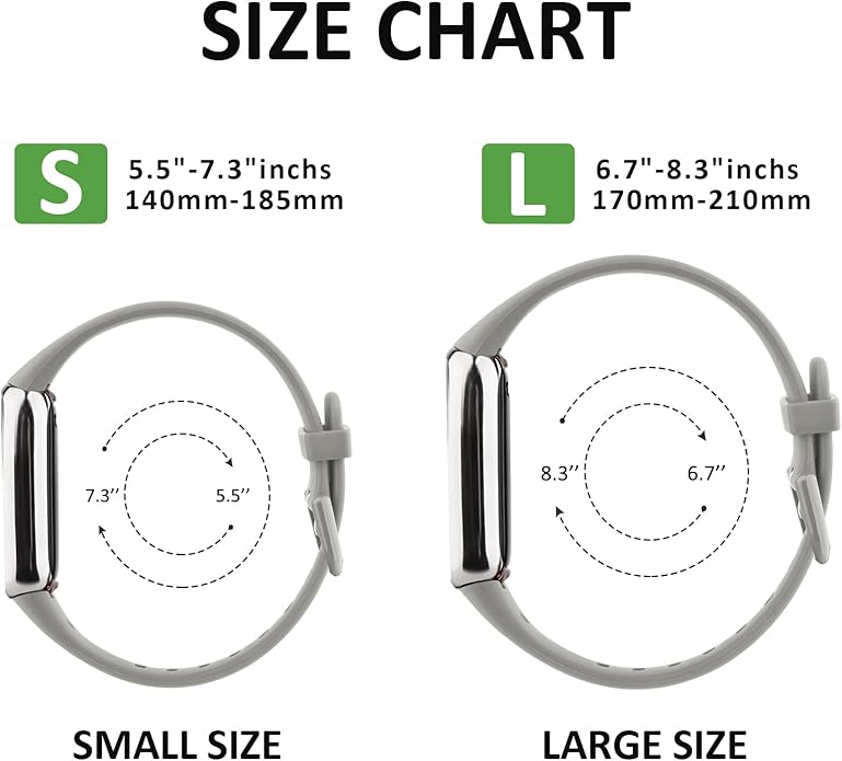 - Two Sizes Choices : Small Size for 5.5" - 7.3" (140 mm-185mm) wrist, Large Size for 6.7" -8.3" (170mm-210mm) wrist. Various bright colors can personalize your Fitbit Luxe to fit your mood and outfit in daily life, elevates your style for every occasion.