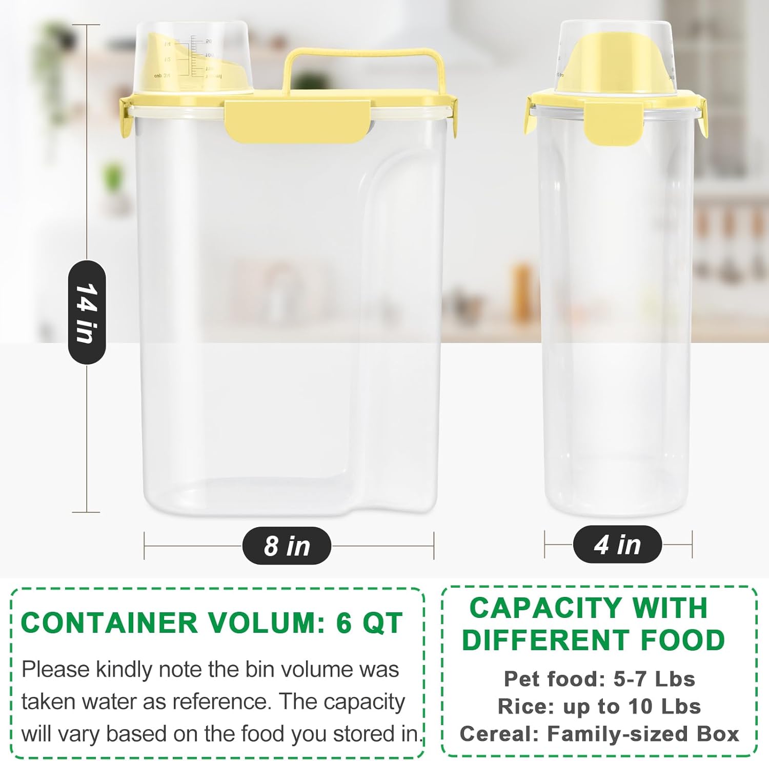 - Large Pet Food Container Set: TBMax dog food storage containers come with two 6-qt bins that each one can hold about a 5 to 7 lbs bag of dry dog food or cat food, which depending on the particles of the pet food. Ideal for storing small pet food like kitten puppy kibble, bird seeds, fish food and more