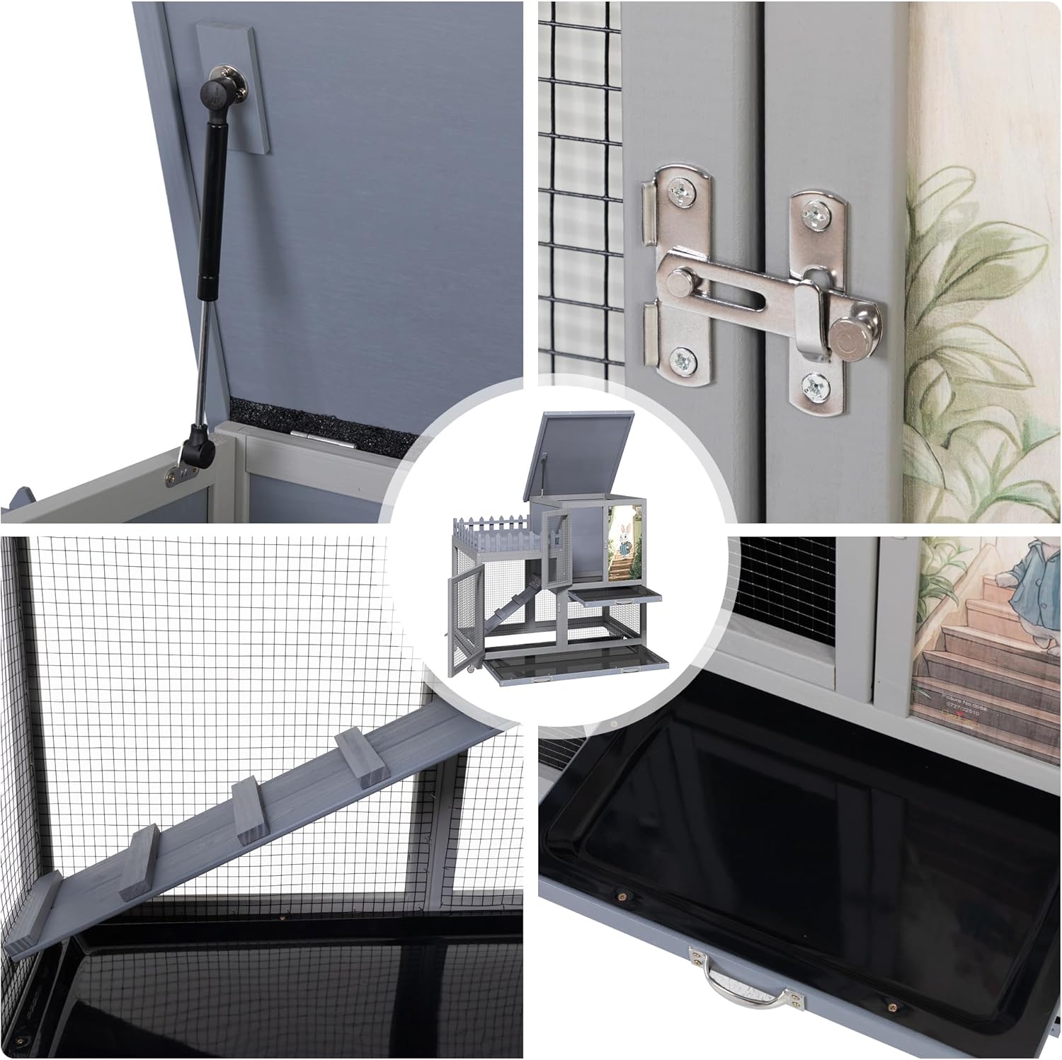 COZIWOW Double Layers Durable 38In Rabbit Hutch Indoor on Wheels, Small Animal Houses Habitat, Rolling Large Bunny Cage Outdoor with Removable Tray, Ramp, Two Story Bunny Cage(Grey with Pattern)