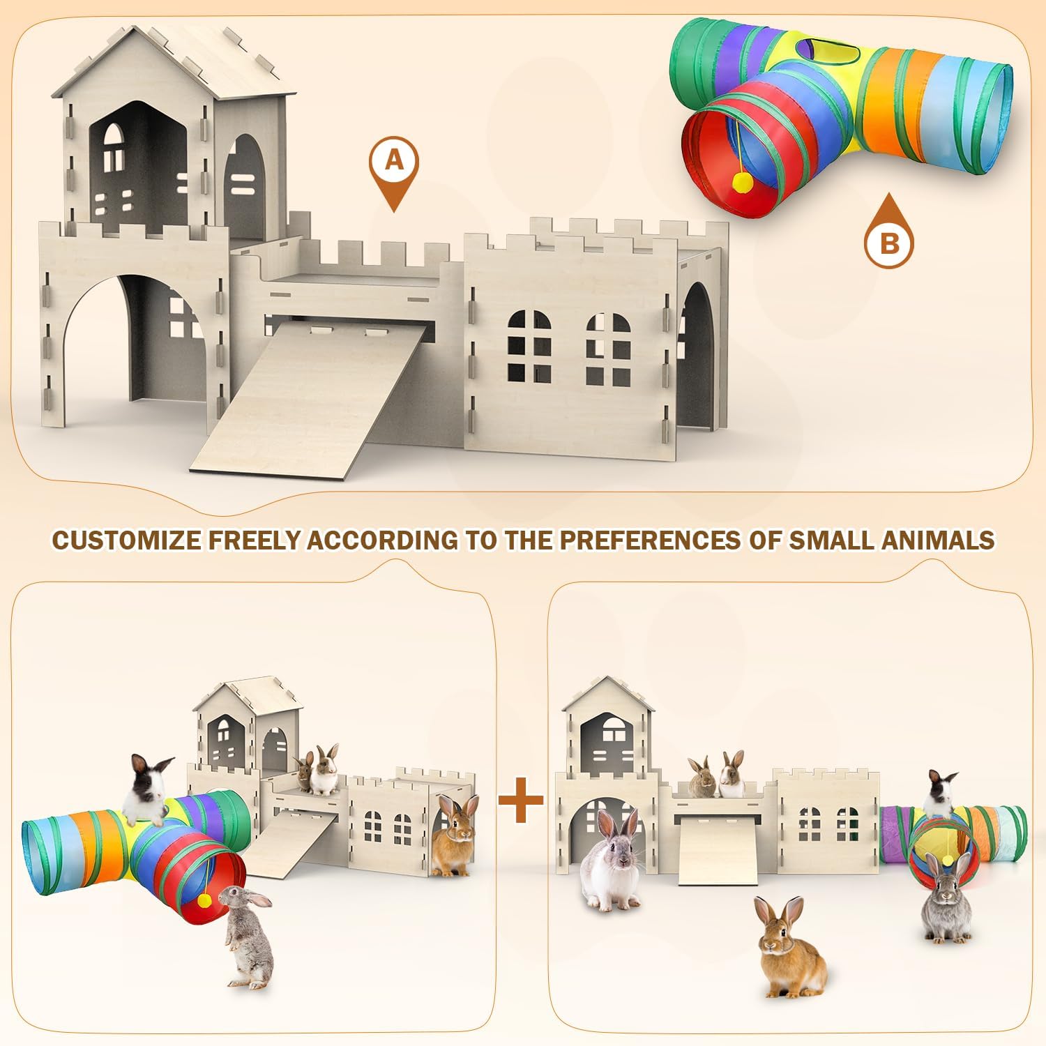 Large Bunny House and Hideouts, Wooden Dual-Layer Rabbit Castle with Stair, Rubber Band-Free Setup - Chew-Proof, Sturdy Habitat for Guinea Pig Chinchilla Ferret (Rabbit House)