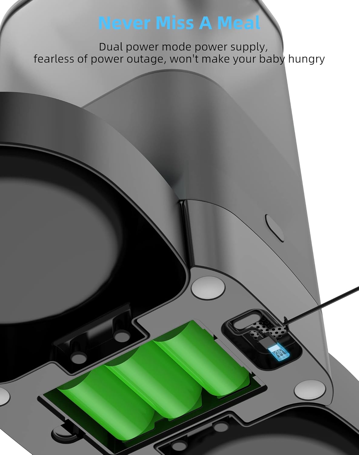 - [Dual Power Supply ] The timed cats feeder can be powered by USB power adapter and 3 alkaline D-size batteries (NOT Included). Once the feeding schedule is set, it is repeated every day. In the event of a power outage, the automatic feeder will automatically switch to battery power. For safety reasons, it is recommended to use Battery power sources. Battery alone can supply power for 200 days.No need to worry about your pet going hungry while you are away.
