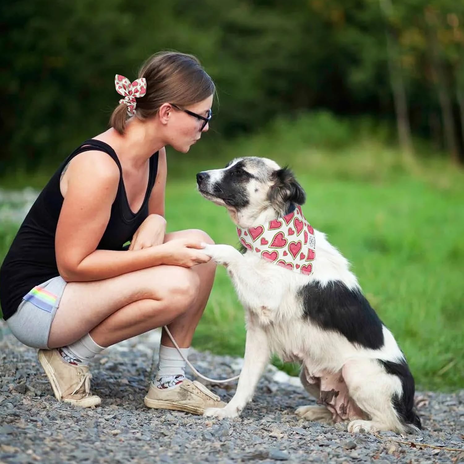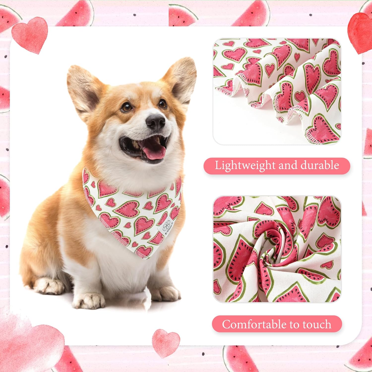 E-Clover Pink Watermelon Dog Bandanas & Matching Scrunchie Set Cute Heart Dog Scarf Bibs Pet Bandana with Bow Tie for Medium Large Dogs Owner Mom Spring Summer