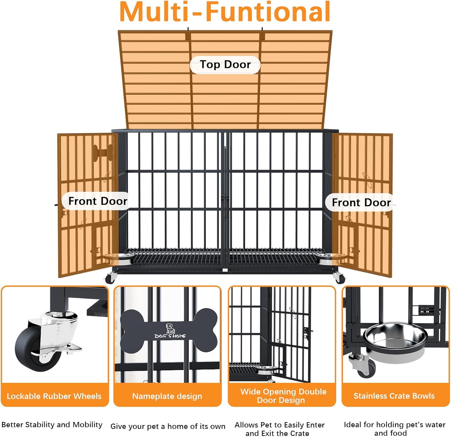- 【Easy Access & Feeding】Each dog crates has double doors and a reversible top for easy access to almost anywhere. The top is open. The kennel also has two small feeding doors with locks. These doors allow quick and easy access to stainless steel dog bowls, swinging bowls without having to open the front door for easy feeding. The two-door design of the kennel is not only easy to enter and exit the kennel, but also easy for you to interact with and feed your dog. This crate has multiple ways to open the door, so you can try agility and obedience to make them grow faster.