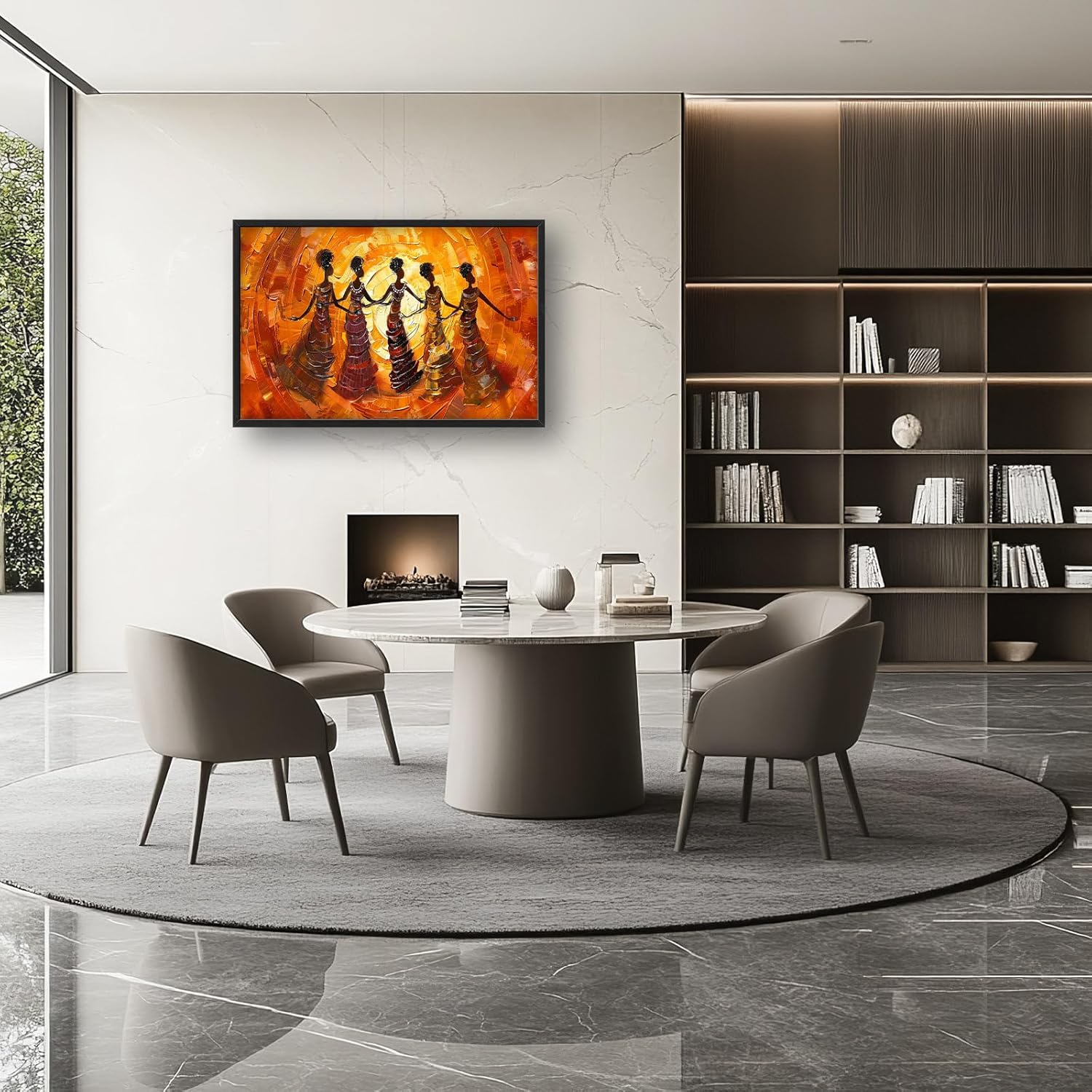 - 【Unique Design】A vibrant painting of five African women in elegant dresses, each holding hands and dancing gracefully around the sun on an orange background. The colors are warm with shades of reds, oranges, yellows, and golds creating a lively atmosphere. This artwork symbolizes unity among black people.
