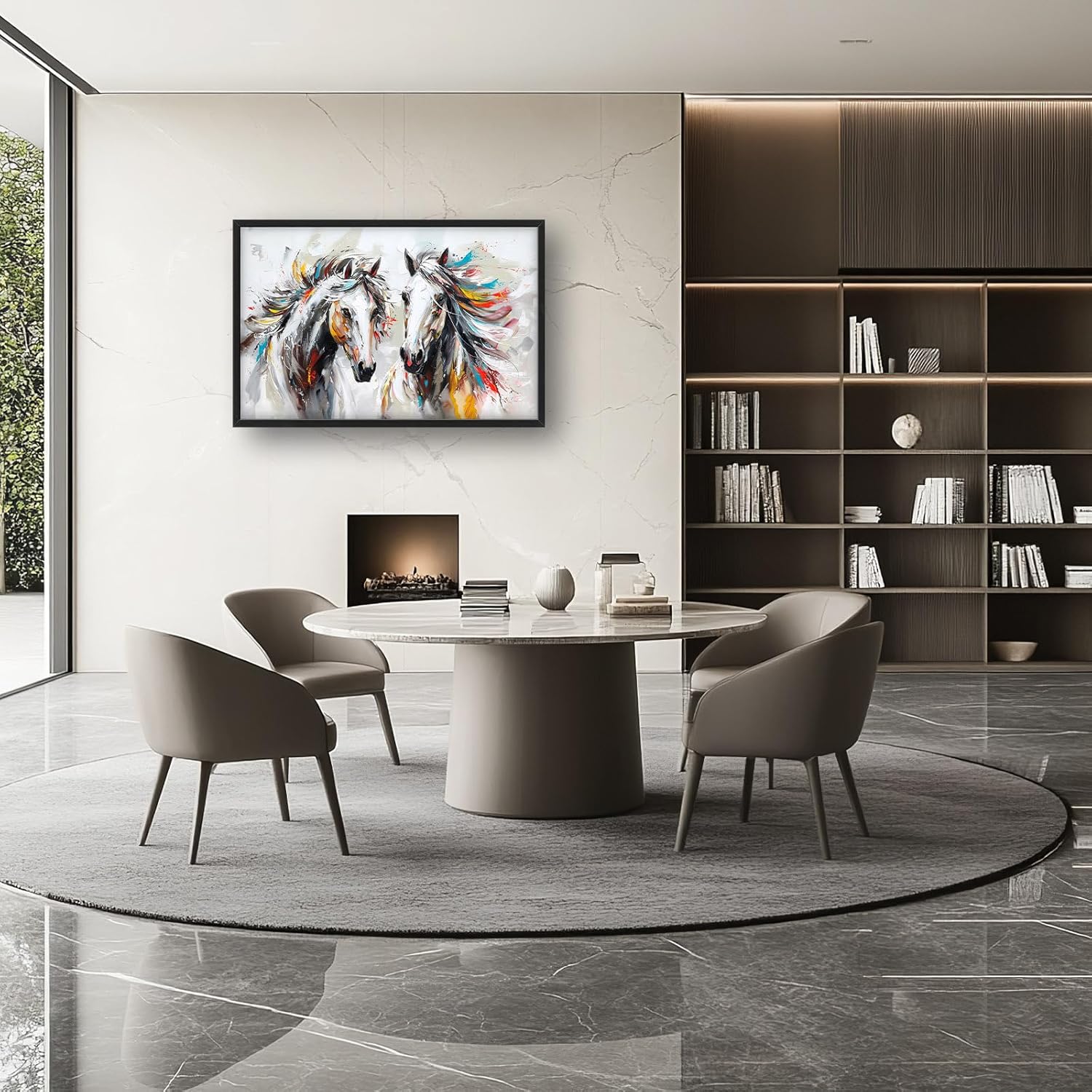 - 【Unique Design】Two horses with flowing manes, white background, colorful oil painting style, large brushstrokes, strong contrast between light and dark, fast running posture, bright colors, high saturation, strong sense of dynamism, elegant lines, gorgeous atmosphere.