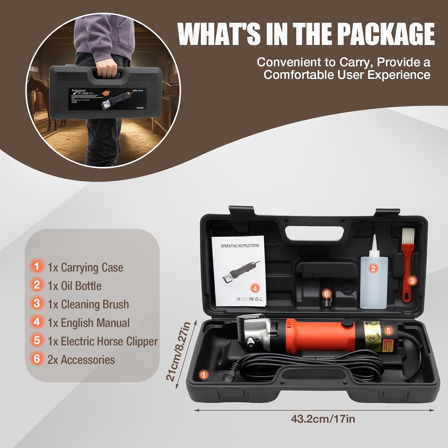 - 【HIGH EFFICIENCY】: Compared with the traditional manual scissors, this electric horse clipper is equipped with a 350W high-powered copper motor with a no-load speed of 2400r/min, which greatly improves the efficiency, making it ideal for farm breeding.