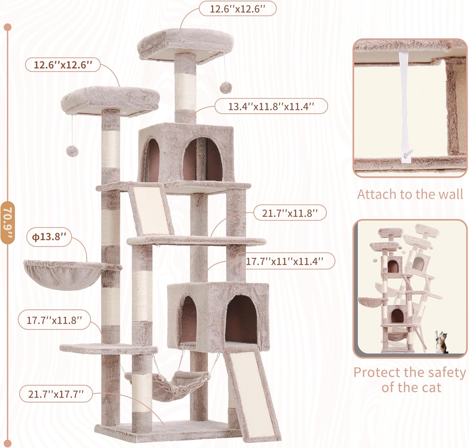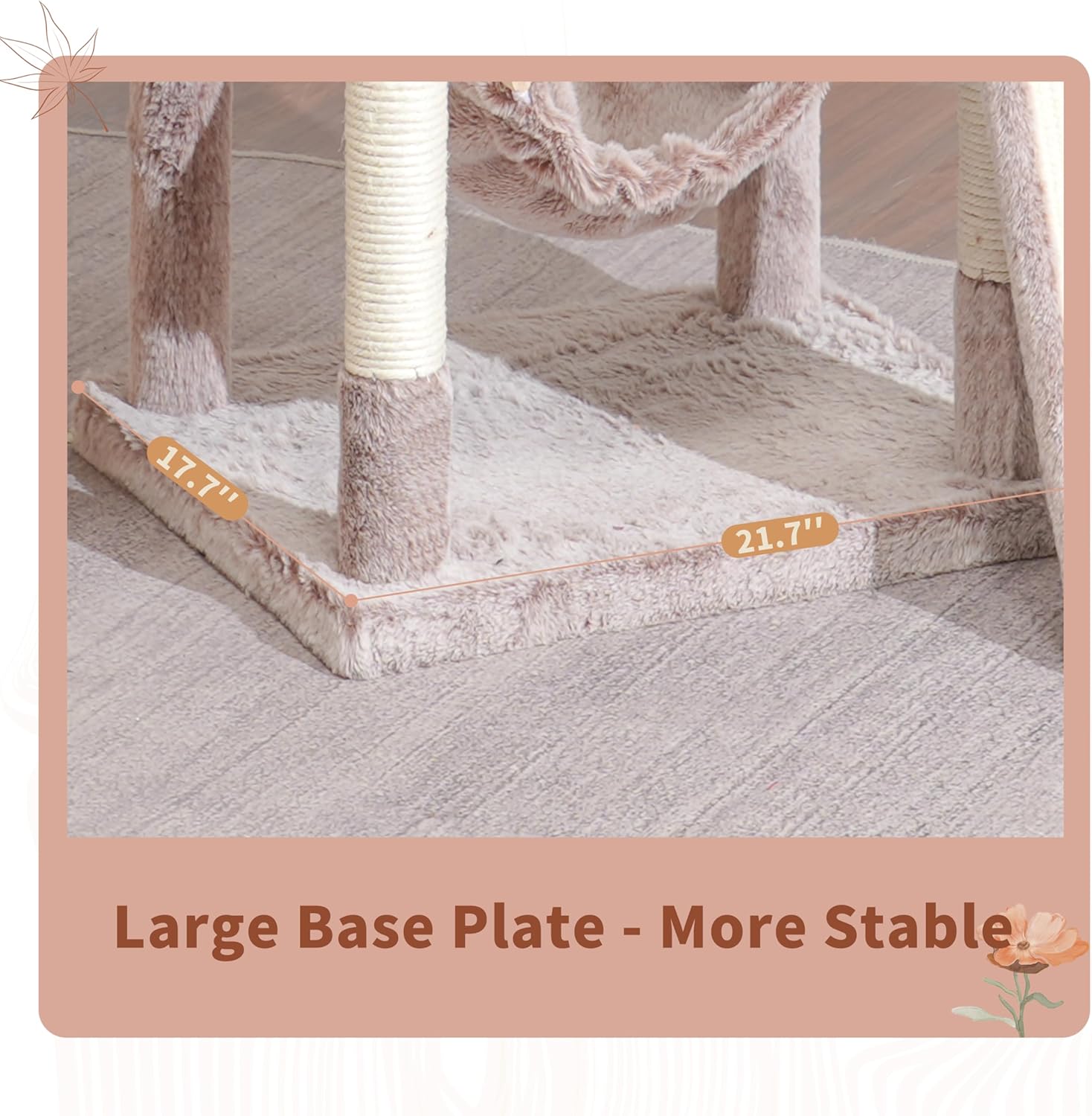 - Large Base, More Sturdy: The spacious base(21.7''L x 17.7''W) provides excellent stability. Additionally, the included anti-tipping straps can be used to secure this cat tree to the wall. Even when adult cats or large cats climb up and down, it is not easy for the cat tree to tip over, making it much safer.