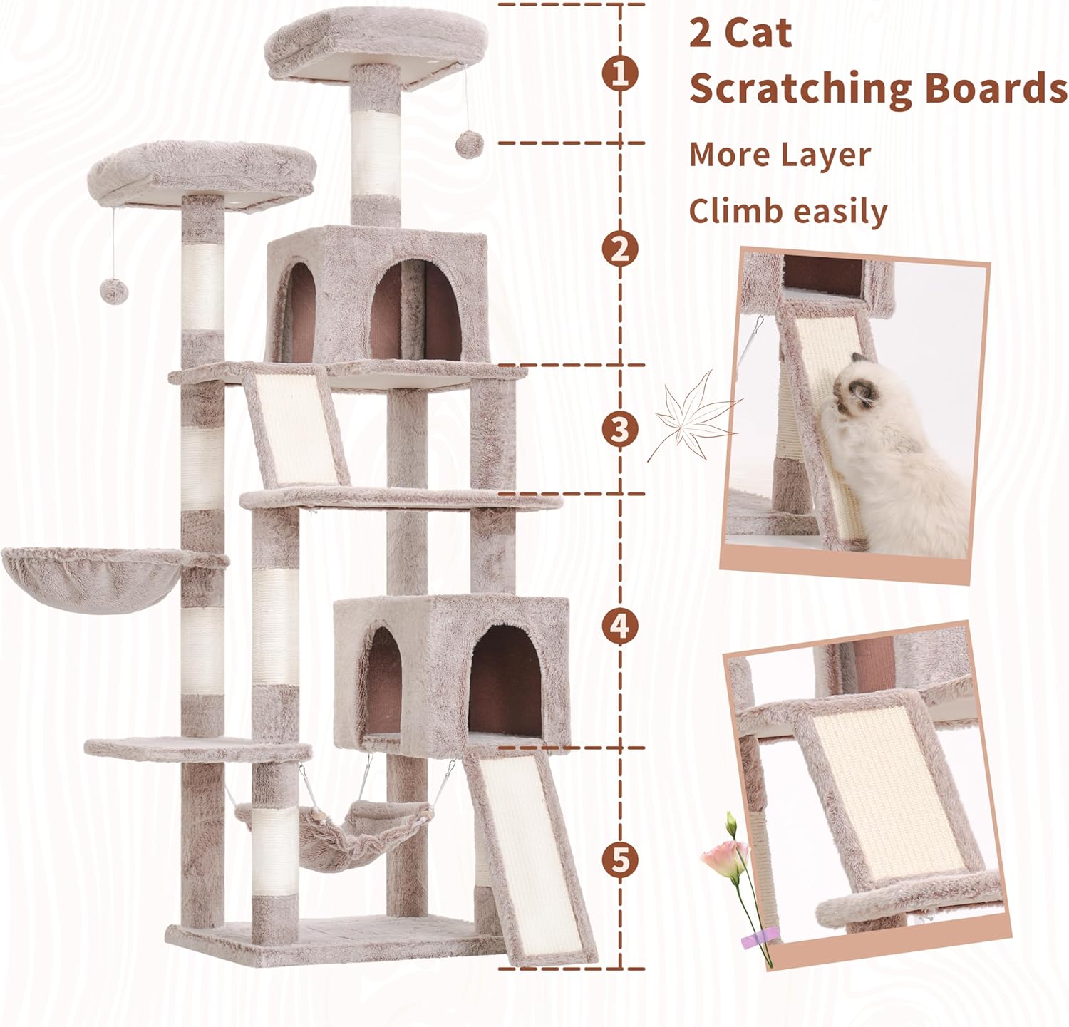 - Multi-level Tall Cat Tree: The design of two independent sisal scratching boards and the platform design for each layer make this cat tree have distinct layers and a reasonable structure. Even kittens and senior cats can climb it with ease.