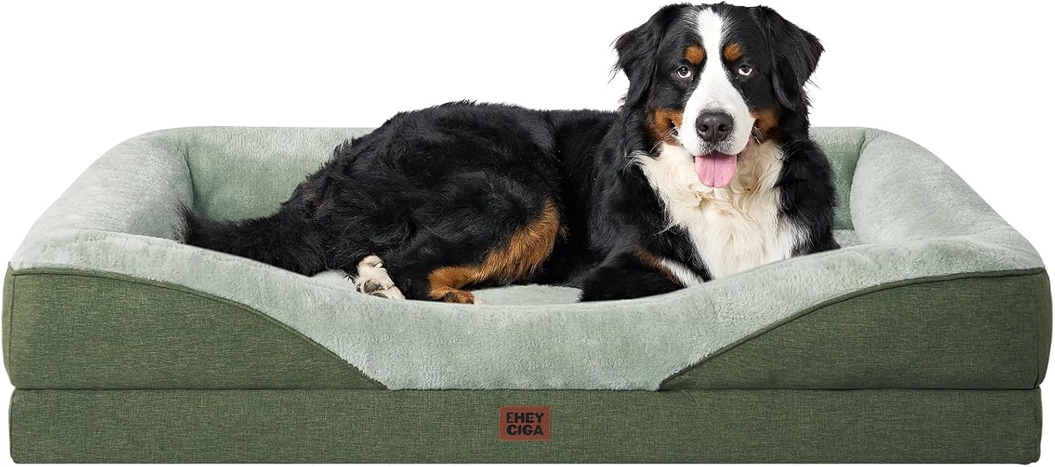 EHEYCIGA Memory Foam XL Dog Bed for XLarge Sized, Extra Large Orthopedic Dog Sofa with Sides and Waterproof Liner, Washable Bolster Pet Couch with Removable Cover, 42x30x7.5 Inch, Green