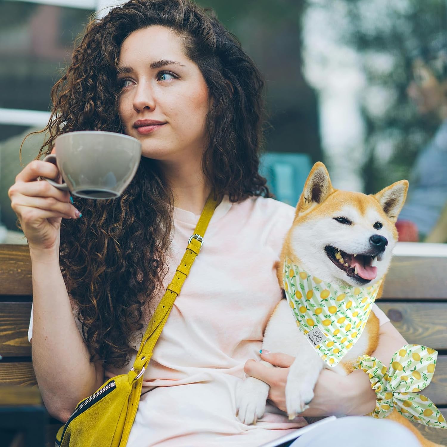 E-Clover Summer Lemon Dog Bandanas & Matching Scrunchie Set Green Stripe Dog Scarf Bibs Pet Bandana with Bow Tie for Medium Large Dogs Owner Mom