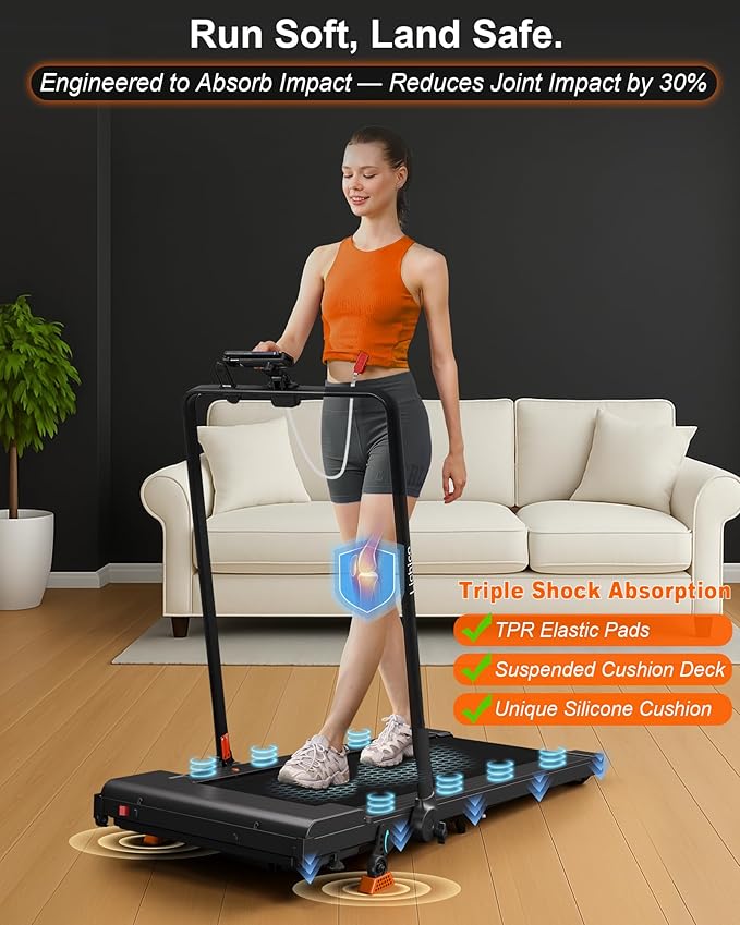 - Advanced Shock Absorption for Joint Safety - Our walking pad treadmill features triple shock absorption—TPR cushions, Suspension deck, and reinforced silicone pads—to protect your knees and ankles during every stride