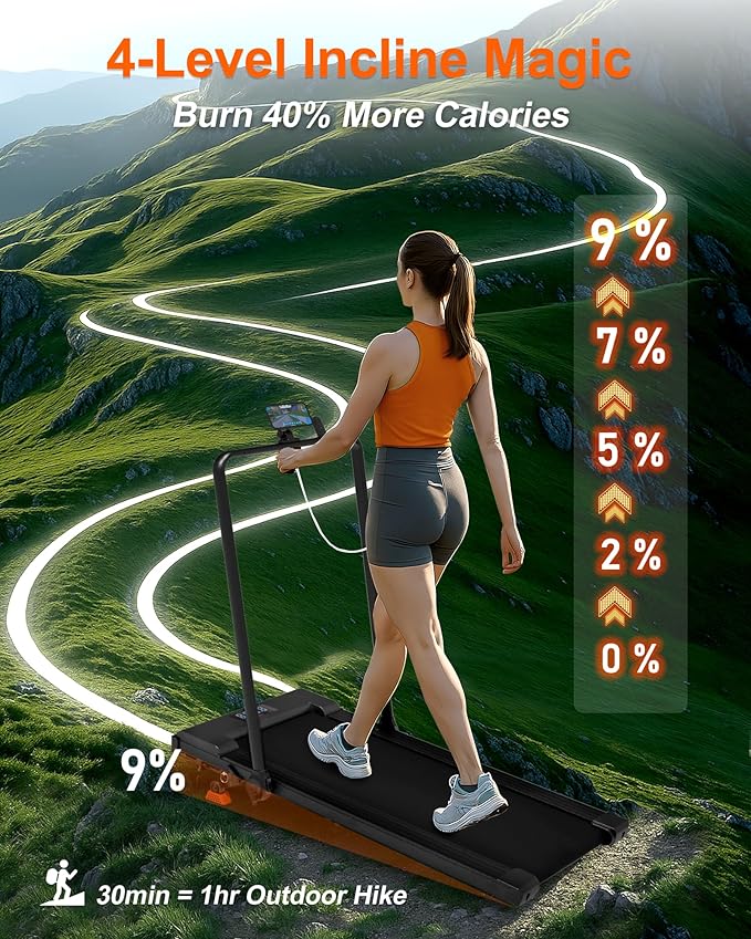 - Treadmill with Incline for Efficient Fat Burn - Achieve up to 9% incline with 4 adjustable levels. This walking pad with incline simulates uphill terrain, helping you burn more calories and strengthen lower body muscles