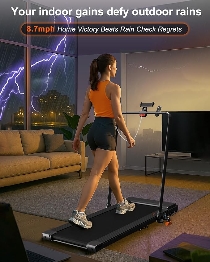 - 2-in-1 Walking Pad with Handle Bar - Switch between walking and running modes with this 2-in-1 foldable treadmill. Speed range: 0–3.7mph (walking) and 3.8–8.7mph (running). Ideal under desk treadmill for both work and workouts