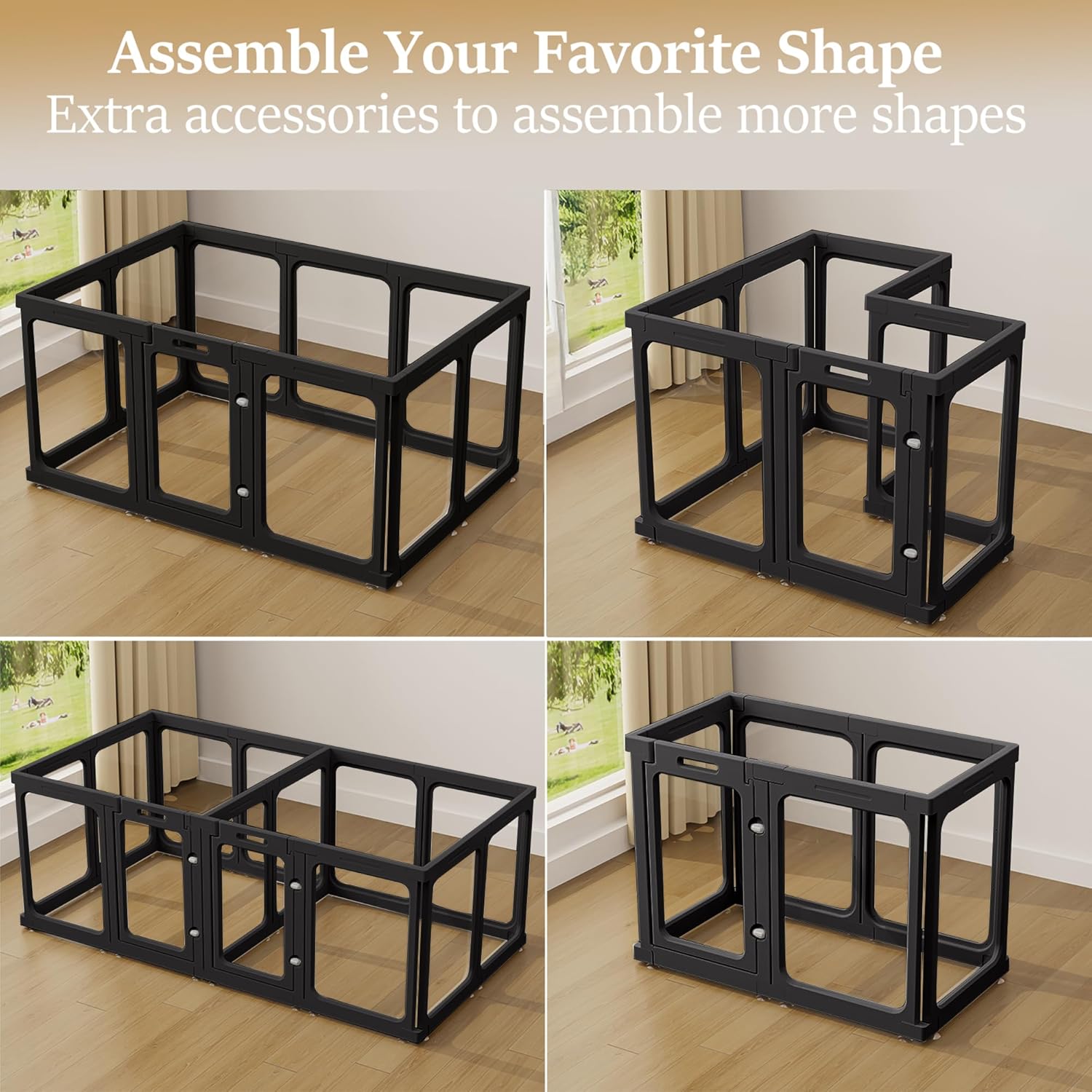 - 【STURDY & STABLE CONSTUCTURE】- When you are assembling the Playpen, you need two connecting buckles on the top and bottom between each two panels, the bottom connecting buckles are with suction cups, no matter what kind of material the flooring is, it can be firmly suctioned to ensure the stability of the Playpen, and it also protects your flooring from scratches.
