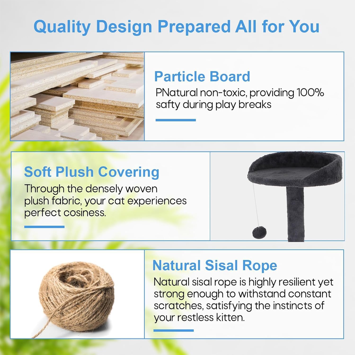 - 🐱 【Posts for Scratching Covered in Sisal 】These are scratching surfaces that are integrated into the framework. Cats love to bury their claws in sisal because it's a sturdy substance with a coarse texture. Our cat tree promotes healthy scratching habits and helps discourage cats from damaging furniture by offering dedicated spaces for them to scratch.
