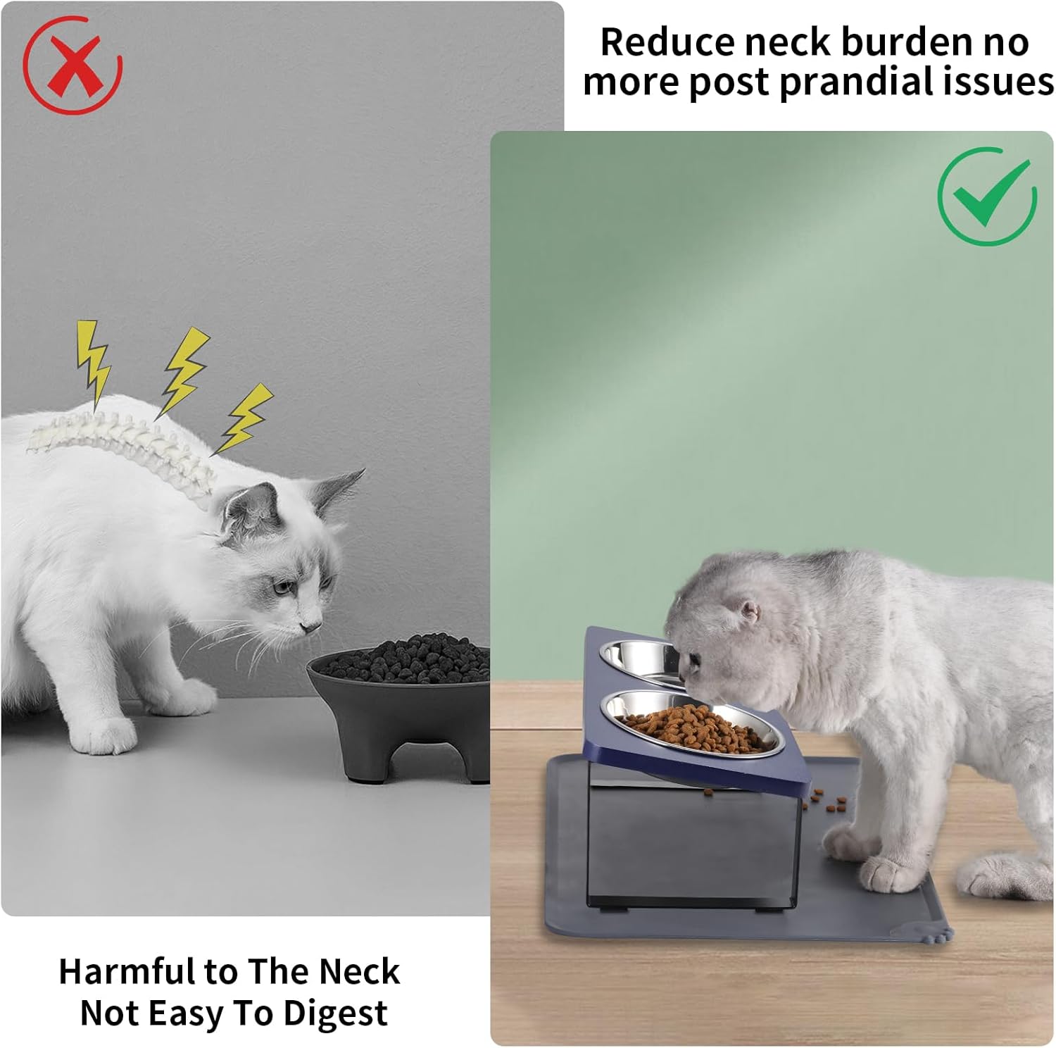 Upgraded Elevated Cat Bowls with Food Mat,15°Tilted Stand Anti Vomiting Raised Cat Dishes for Food and Water,2 Stainless Steel Bowls for Cats and Puppies(Navy Blue)