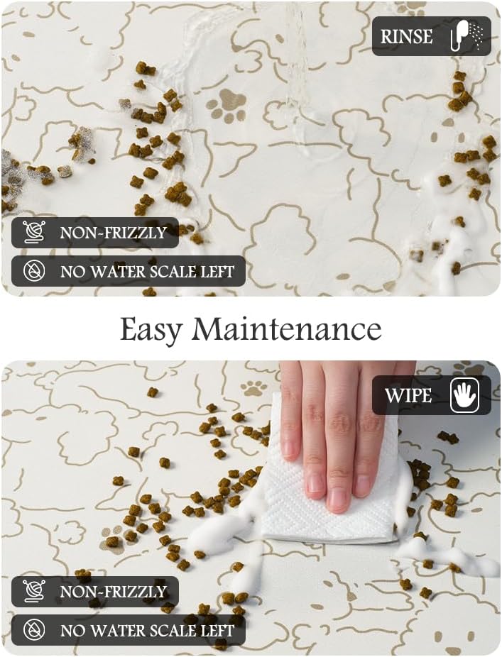 - Keep Clean & No Stains:No marks will be left when food and water are dropped on the dog food mat. Unlike traditional silicone pet feeding mats, our pet feeding mat for food and water won't pick up pet hair or dust, and won't build up tough-to-clean limescale, keeping the dog bowl mat as good as new forever.
