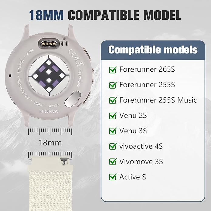 • 18MM COMPATIBLE MODELS: Fit for all traditional watch and smart watch with 18mm width watch lugs. Compatible for Garmin Venu 3S/Venu 2S/Vivoactive 4S/Vivomove 3S/Active S, Forerunner 255S/Forerunner 255S Music/Forerunner 265S