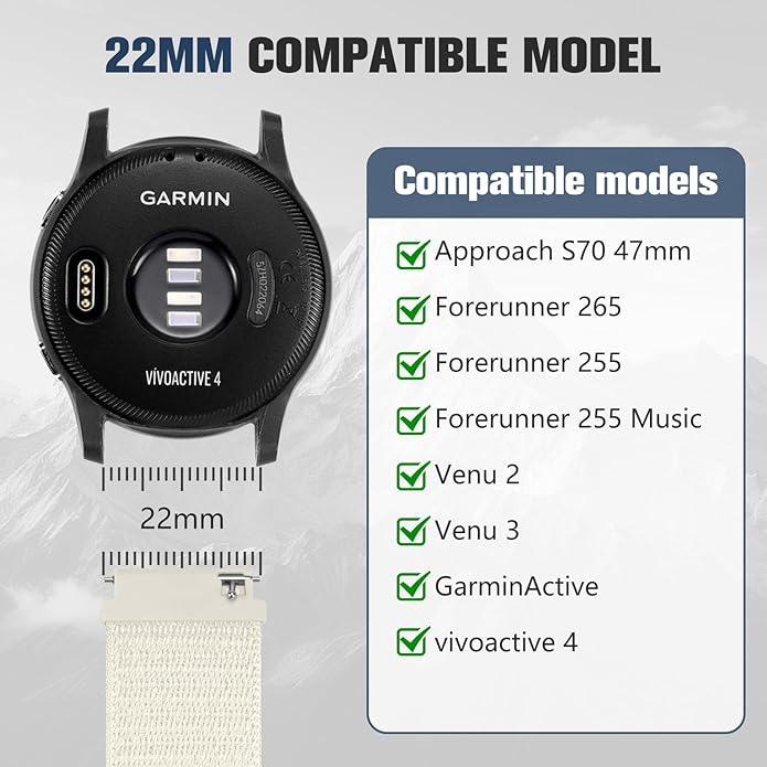- 22MM COMPATIBLE MODELS: Fit for all traditional watch and smart watch with 22mm width watch lugs. 22mm for Garmin Forerunner 265/ 255/ 255 music, Venu 2/ Venu 3, Approach S70 47mm, GarminActive, Vivoactive 4