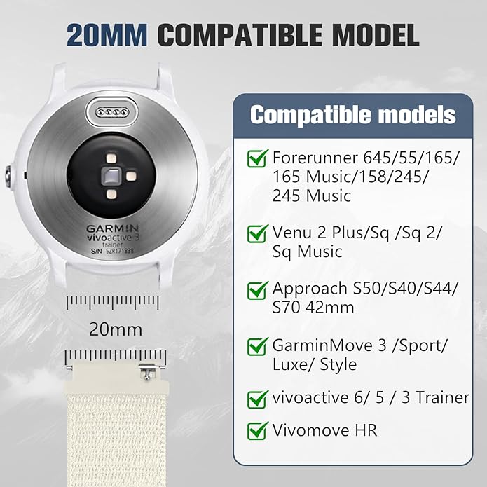 - 20MM COMPATIBLE MODELS: Fit for all traditional watch and smart watch with 20mm width watch lugs. 20mm compatible for Garmin Forerunner 645/ 55/165 /165 Music/ 158/ 245/ 245M Music, Venu 2 Plus/Venu Sq/Sq2/Sq Music, Approach S50/S40/S44/S70 42mm, GarminMove 3/Sport/Luxe/Style, Vivoactive 6/ Vivoactive 5/ 3 trainer/ Vivomove HR