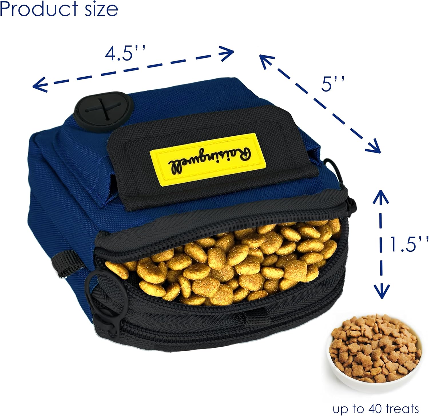 - 1、Fashion Design: This dog training treat bag measures 4.9 x 5.1 inches and offers versatile wearing options. It comes equipped with a carabiner and a strap, allowing you to hang it on your leash, attach it to your pet's collar, or even wear it as a trendy accessory on your bag. The bag features a zipper closure, ensuring that treats stay secure inside even when you're playing with your pet afterward. It's perfect for carrying around or using during short outings.