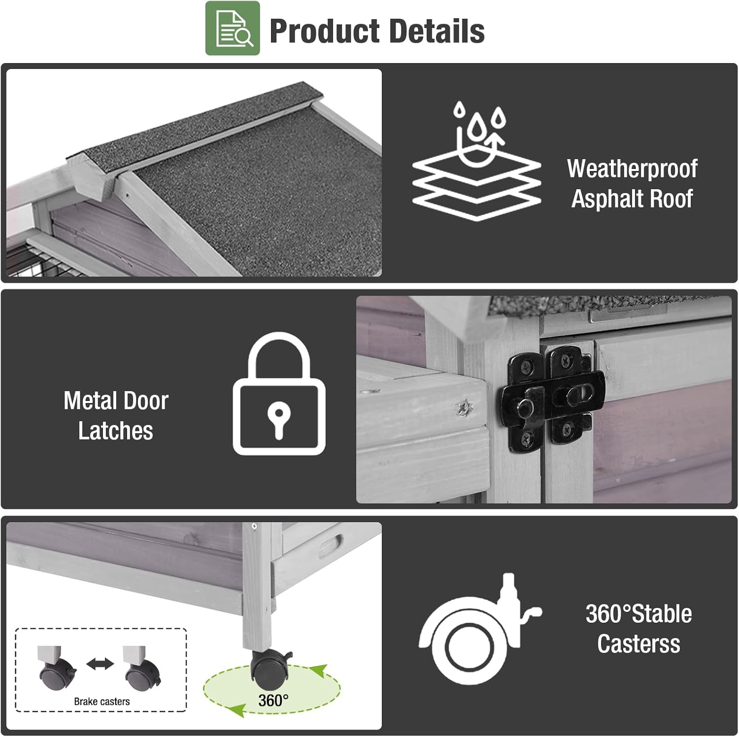 - Mobility and Convenience: The bunny hutch is equipped with four wheels that provide exceptional mobility. Easily move the hutch around your yard or inside your home. Each wheel comes with a locking mechanism that allows you to secure the hutch in place when needed.