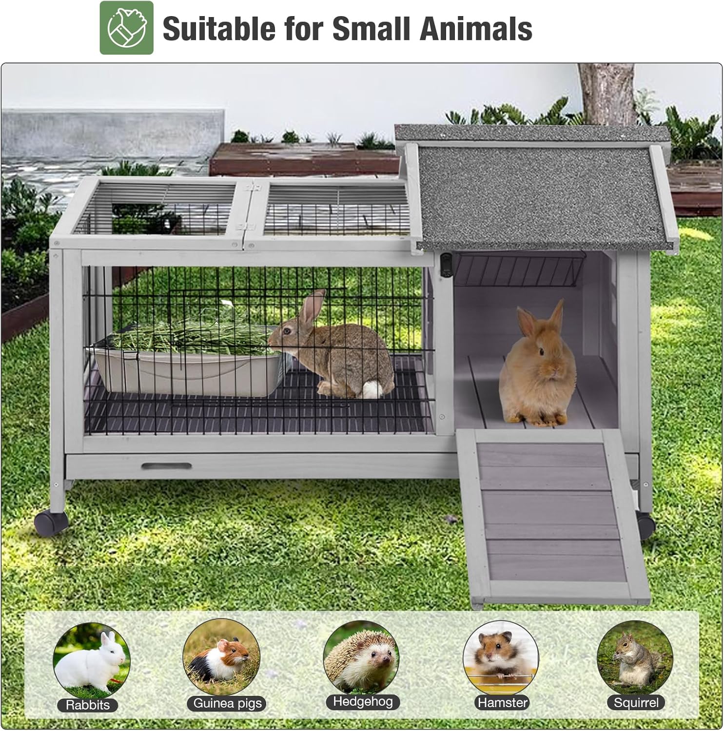 Wooden Rabbit Hutch Indoor and Outdoor, Rabbit Cage with Removable Wire Netting and Leak Proof Tray, Mobile Bunny Cage with Wheels