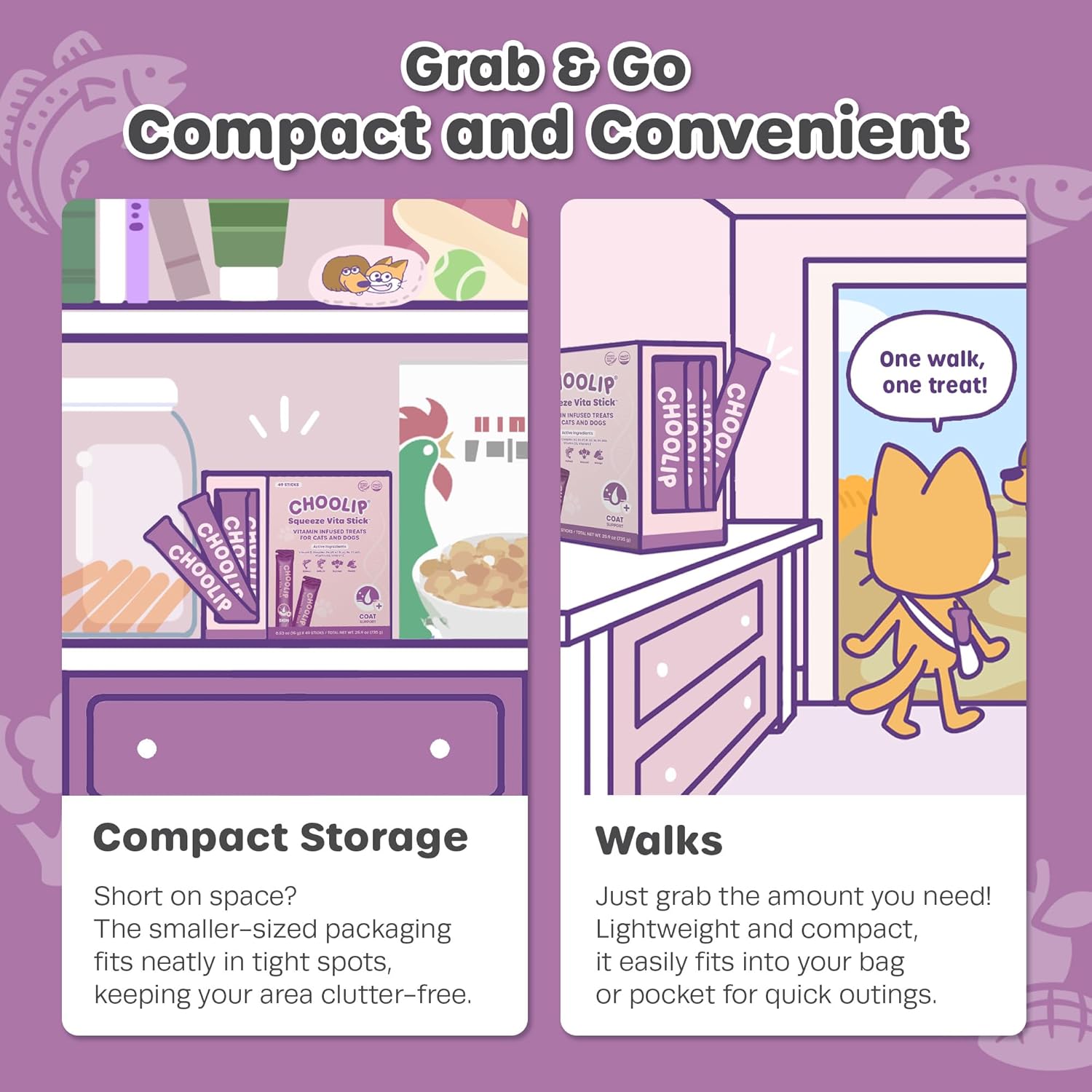 - COMPACT DISPENSER PACK: This Skin and Coat Support pack includes 49 sticks to treat your cat or dog. It’s perfect for quick, grab-and-go use, easy to carry in a bag for trips, or convenient to keep near your pet supplies.