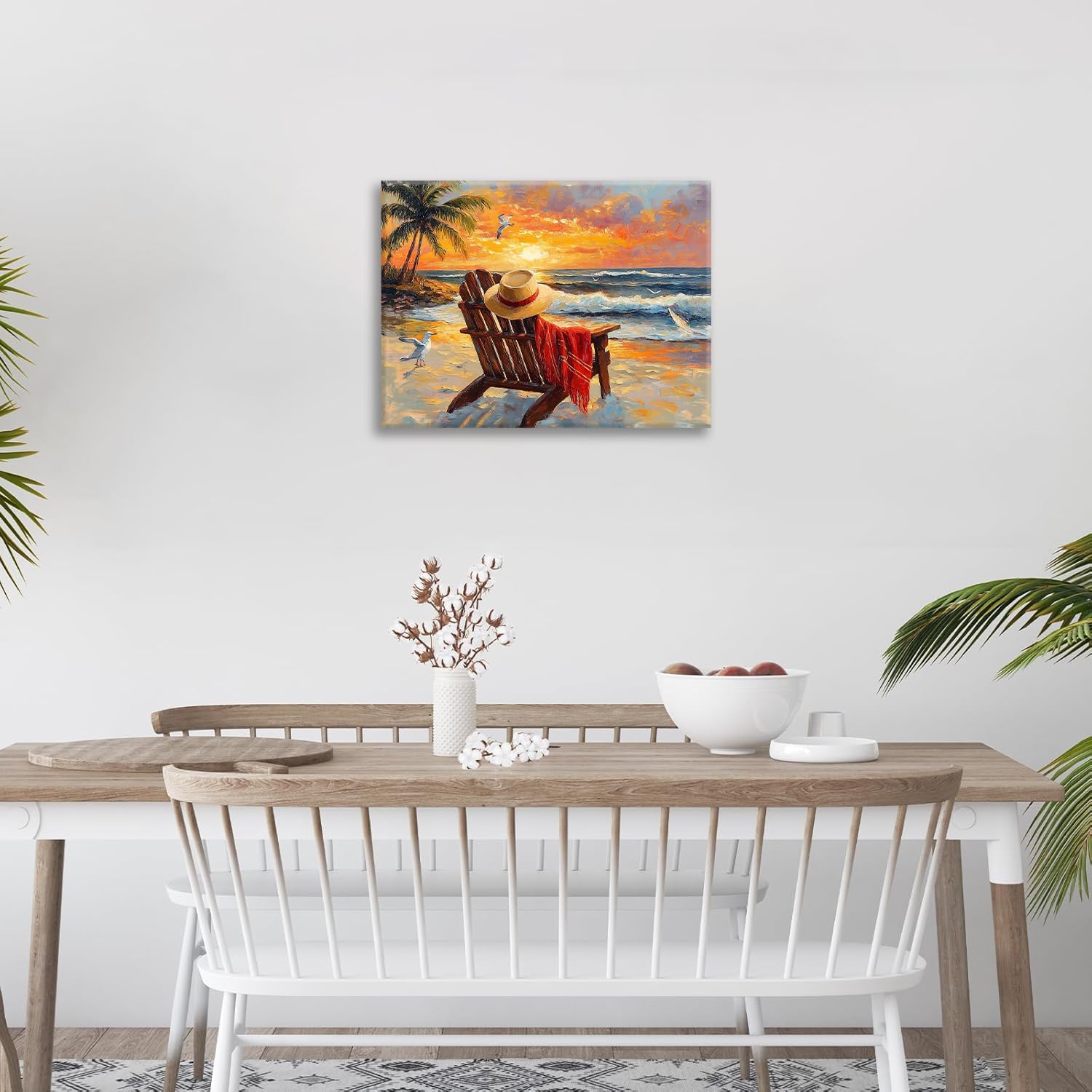 Beach Coastal Bathroom Pictures Wall Art, Seaside Ocean Bathroom Wall Decor, Sunrise Palm Framed Painting Canvas Artwork for Bedroom Living Room Decorations 16"L x 12"W