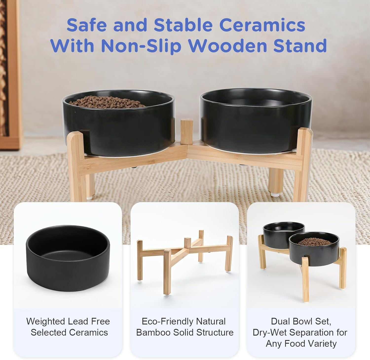 - Stable, Tip‑Resistant Design – A solid bamboo frame with Chew‑Resistant Heavyweight Ceramic, wide stance, and slip‑proof silicone pads join forces to create raised dog bowls that STAY IN PLACE on tile, wood, or laminate. Fewer spills mean cleaner floors and no accidental gouges or scratches or noisy