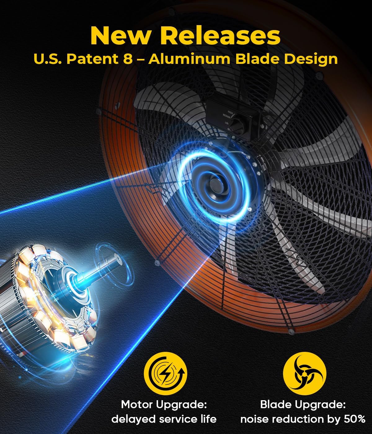 - Upgraded 24“ High Velocity Industrial Drum Fan: Quieter 3-speed electric motor and 8 unique aluminum blades allow airflow up to 9,500 cubic feet per minute. 840/998/1130 rpm. thinner and lighter than other 24” drum fans, but with more airflow and better noise control. Recommended for use in warehouses, factories, garages, workshops and other large locations.