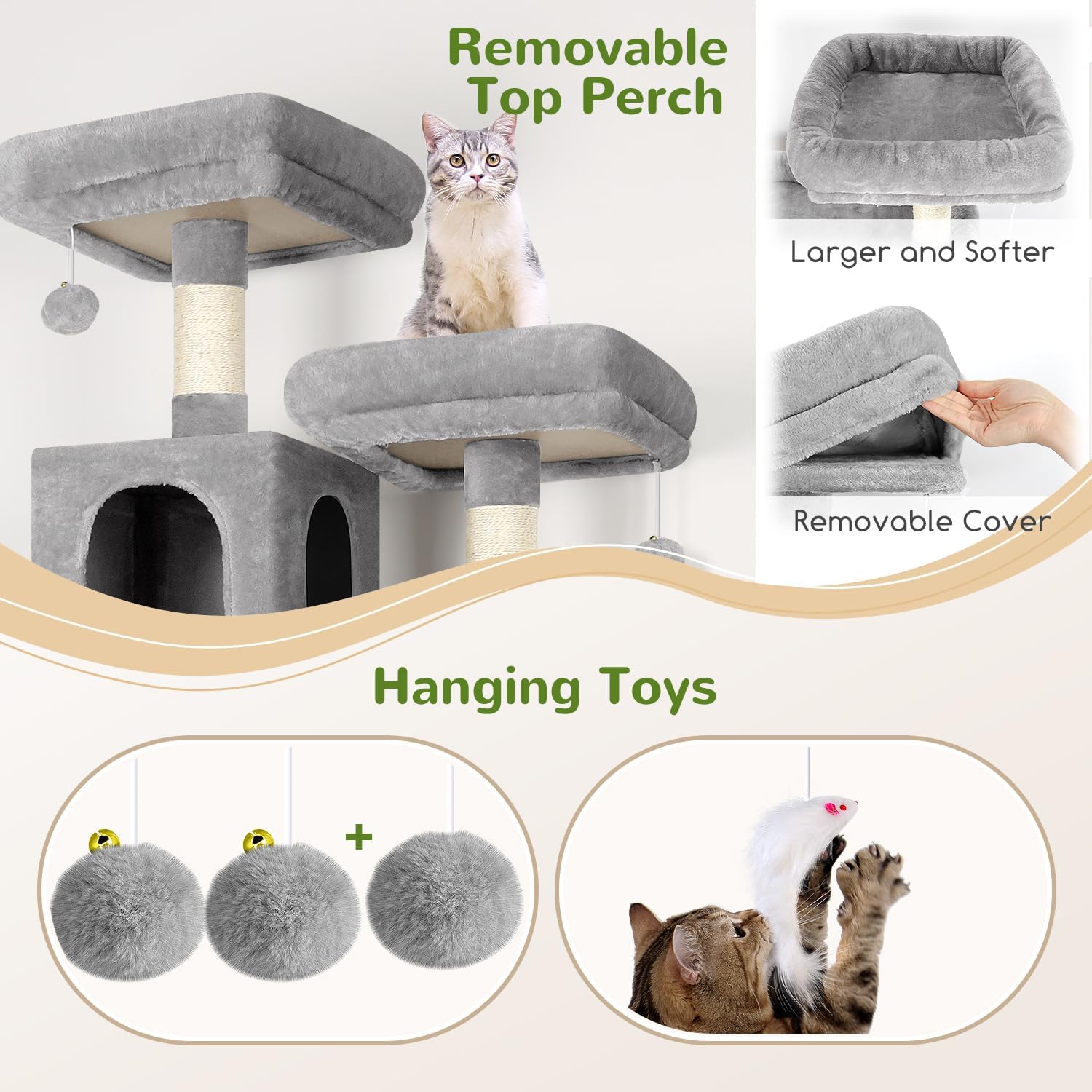 - Easy to Clean and Maintain: The surface materials of the cat tree are easy to clean, allowing you to maintain a hygienic living environment for your cats effortlessly. With easy disassembly, maintenance is a breeze, giving you peace of mind