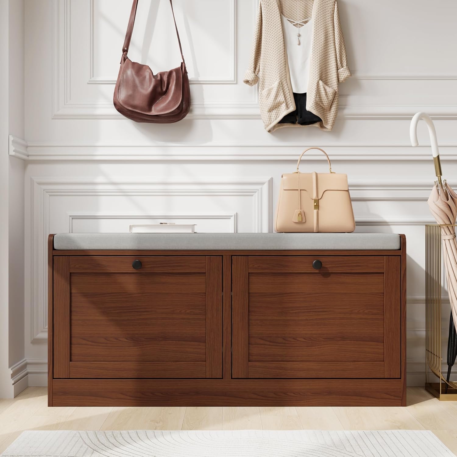 MHOM Brown Modern Entryway Bench with 2 Flip Drawers, Entryway Shoe Bench with Padded Seat Cushion, Wooden Storage Bench for Bedroom and Apartment
